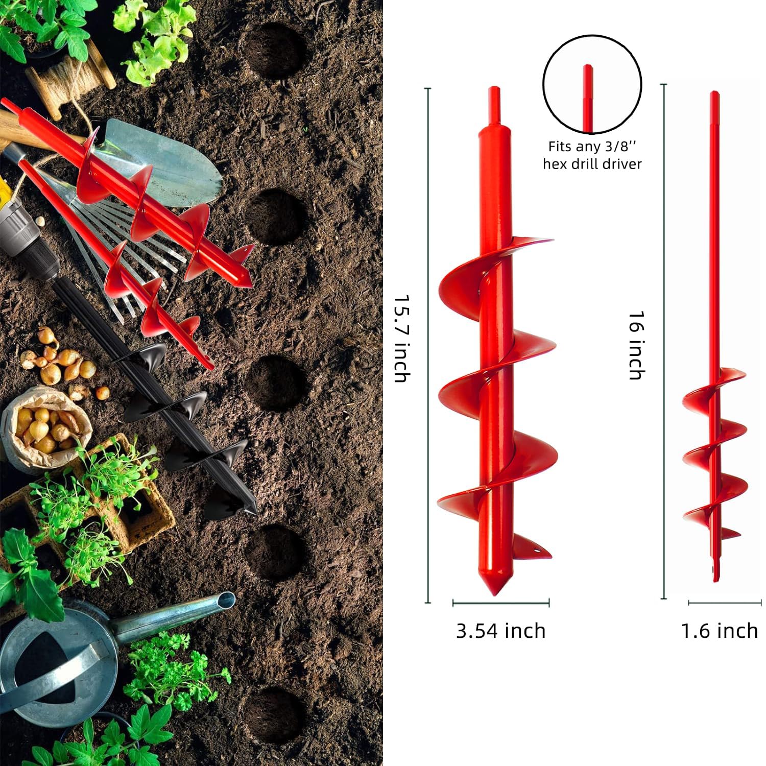 - 【Contain 2 pack Auger Drill Bit】:Our garden auger drill bit set 1.6 x 16 & 3.54 x 16.7 inches for detailed planting.All you need to do is attach the auger bit to a standard 3/8’’ hex bit drill.Hold with both hands,then turn it on to dig downward.Reverse the drill to pull the soil back up,and you get the perfect postholes