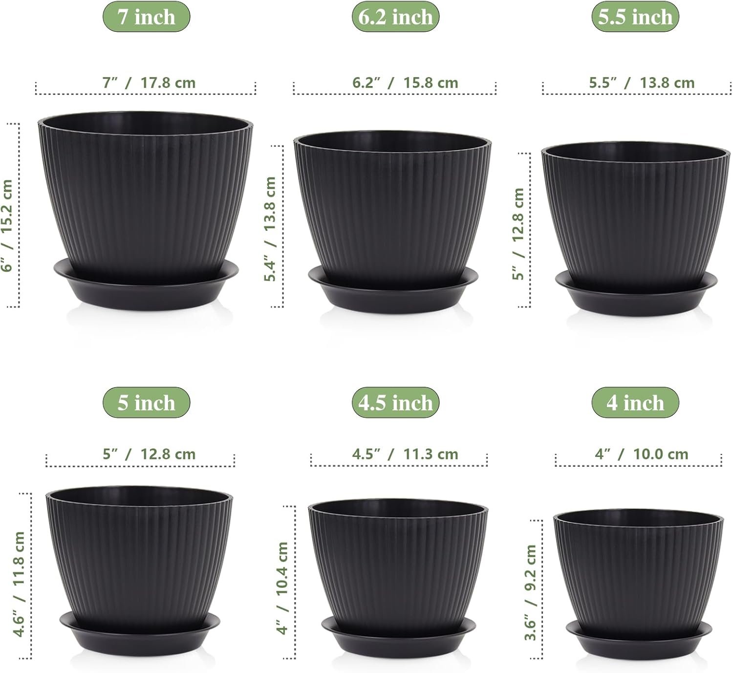 7/6.2/5.5/5/4.5/4 inch Flower Pots, 6 Pack Plant Pots for Small Indoor Outdoor Plants, Plastic Planters with Drainage Holes and Saucers for Garden Succulent House Plants, Black