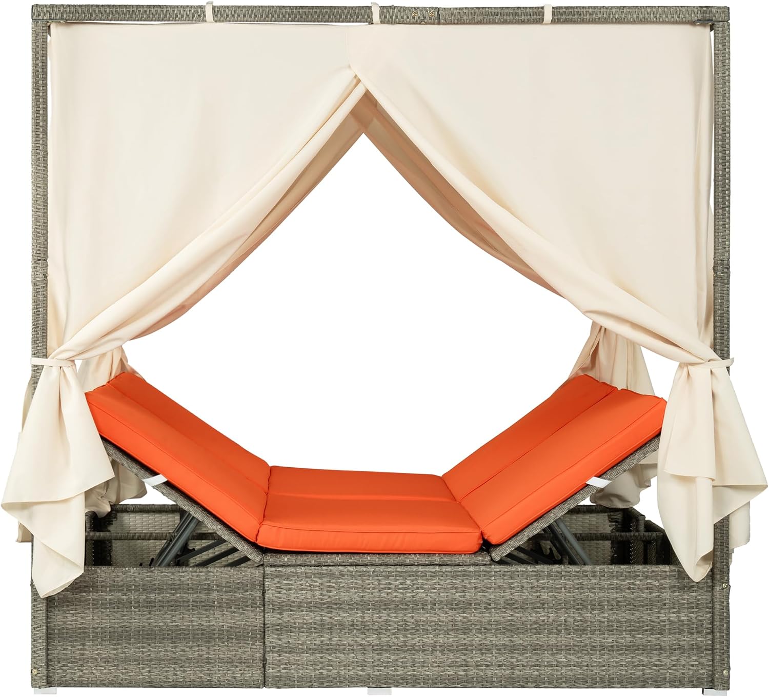 Patio Chaise Lounge, Gray PE Rattan Outdoor Patio Wicker Sunbed Daybed with Adjustable Seats, Four-sided Canopy, Overhead Curtain and Orange Cushion for Backyard, Garden, Poolside (for 2-6 people)