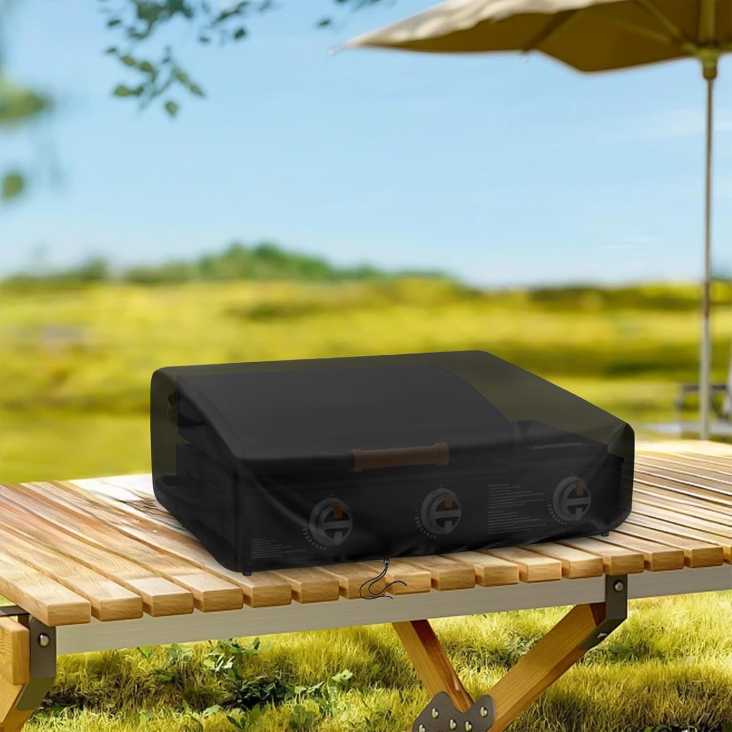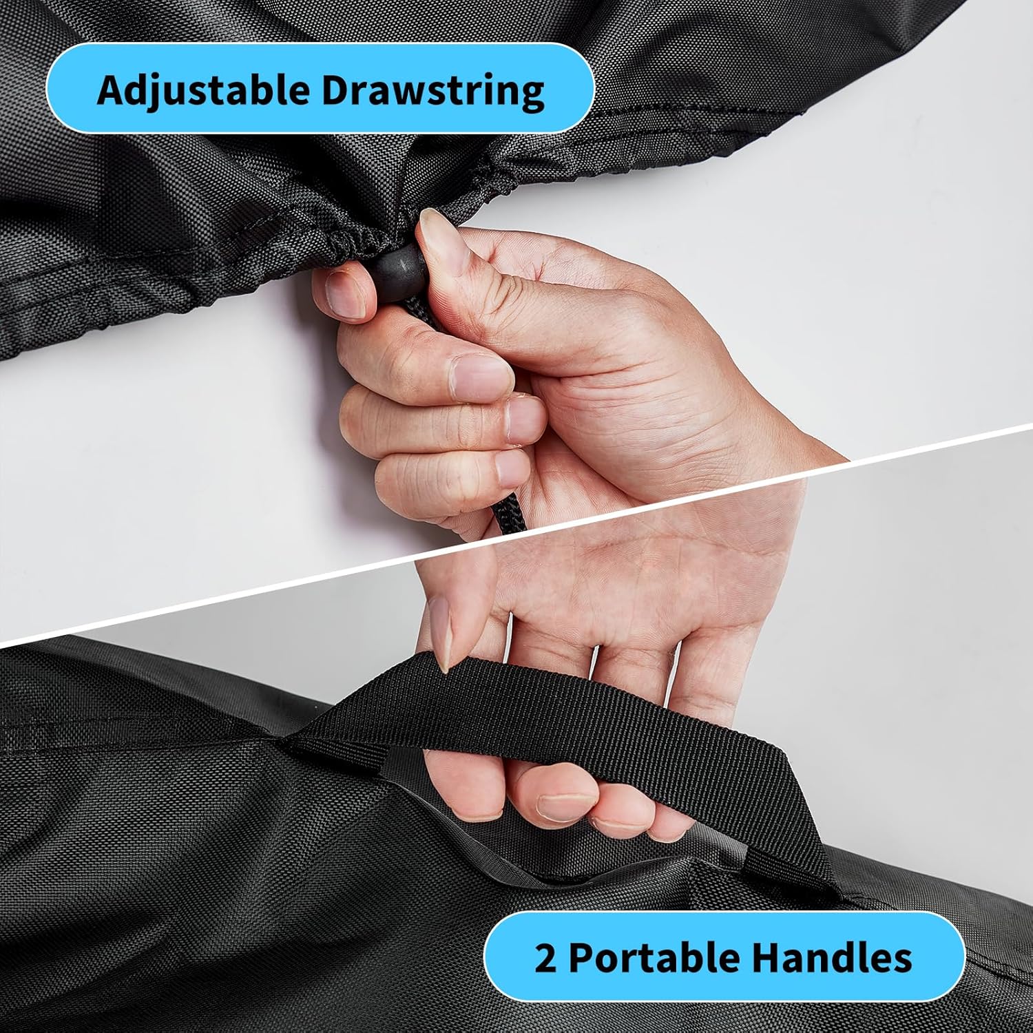 - FITTING DESIGN: Portable outdoor grill covers are thoughtfully designed with adjustable drawstring and portable handles. Adjustable drawstring can make the grill cover fit the grill better and not easy to be blown off by the wind. Portable handles make it easier for you to install / remove the outdoor grill cover.