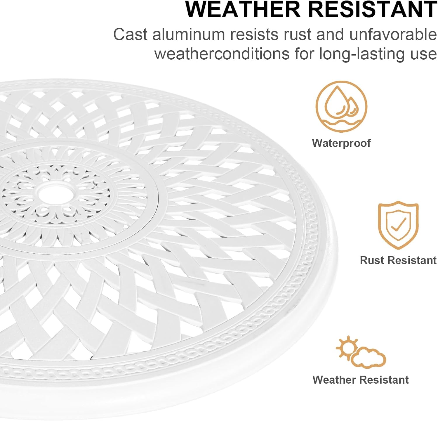- All Weather Materials: Made of sturdy cast aluminum with a rust-resistant and fade-proof finish. Our patio bistro set is durable but lightweight, the maximum weight capacity of table is 250lbs, maximum weight capacity of a single chair is 300lbs.