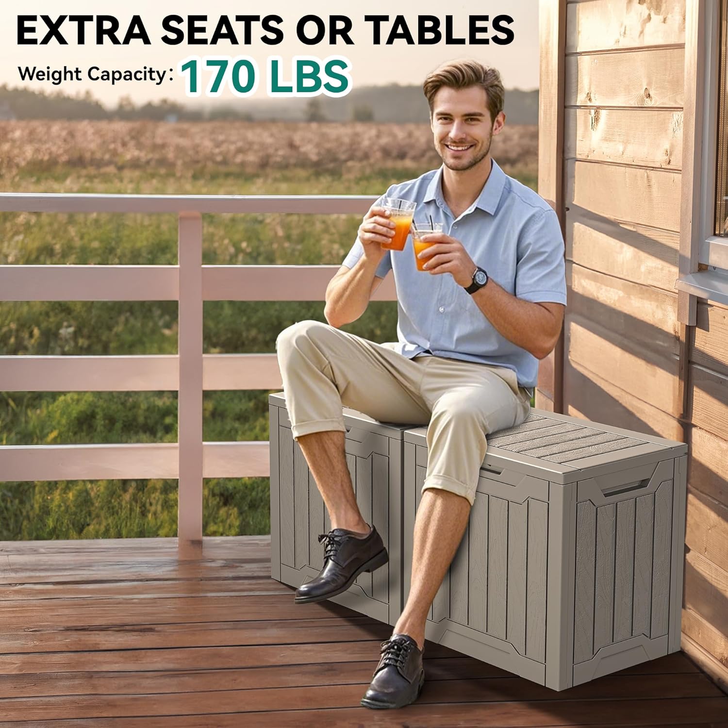 - Multipurpose Use: Our 30-gallon deck box features an attractive wood-like texture, making it ideal for storing outdoor supplies, pool accessories, and beach towels with natural appeal; It also serves as a storage bench, side table, or patio table