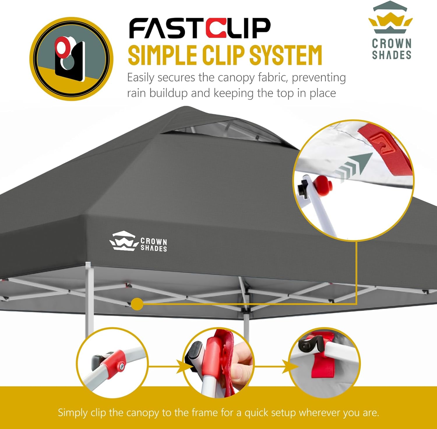 - HIGH GRADE STEEL FRAME - The durable, high-grade, corrosion-resistant steel truss frame with hardened through bolts comes pre-assembled and can be set up without any tools. Engineered to support up to 120 lbs. distributed across the frame, it ensures robust and reliable performance. The extended ceiling assembly and upgraded high peak design make it easier for rainwater to run off, preventing water pooling on the canopy. Perfect for extended outdoor use at markets, festivals, and exhibitions