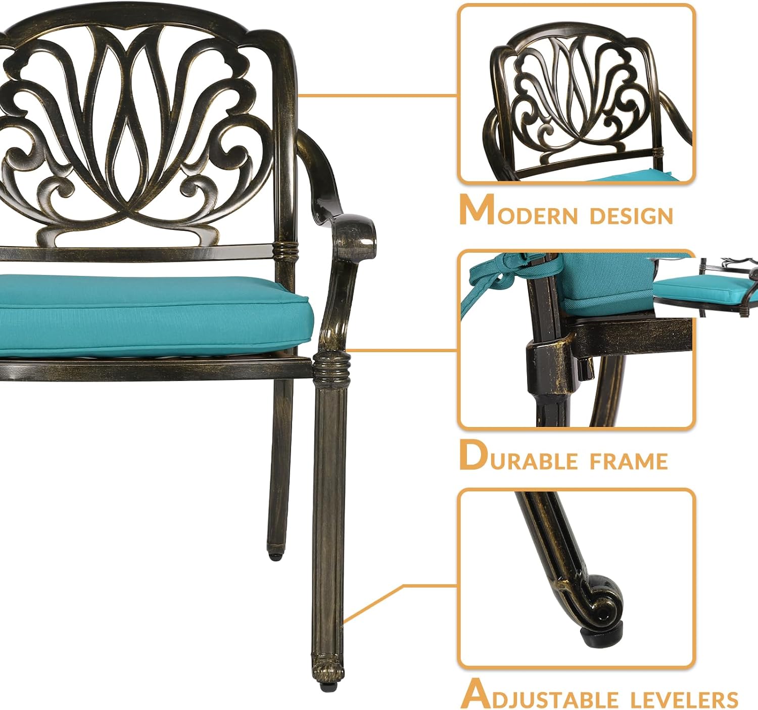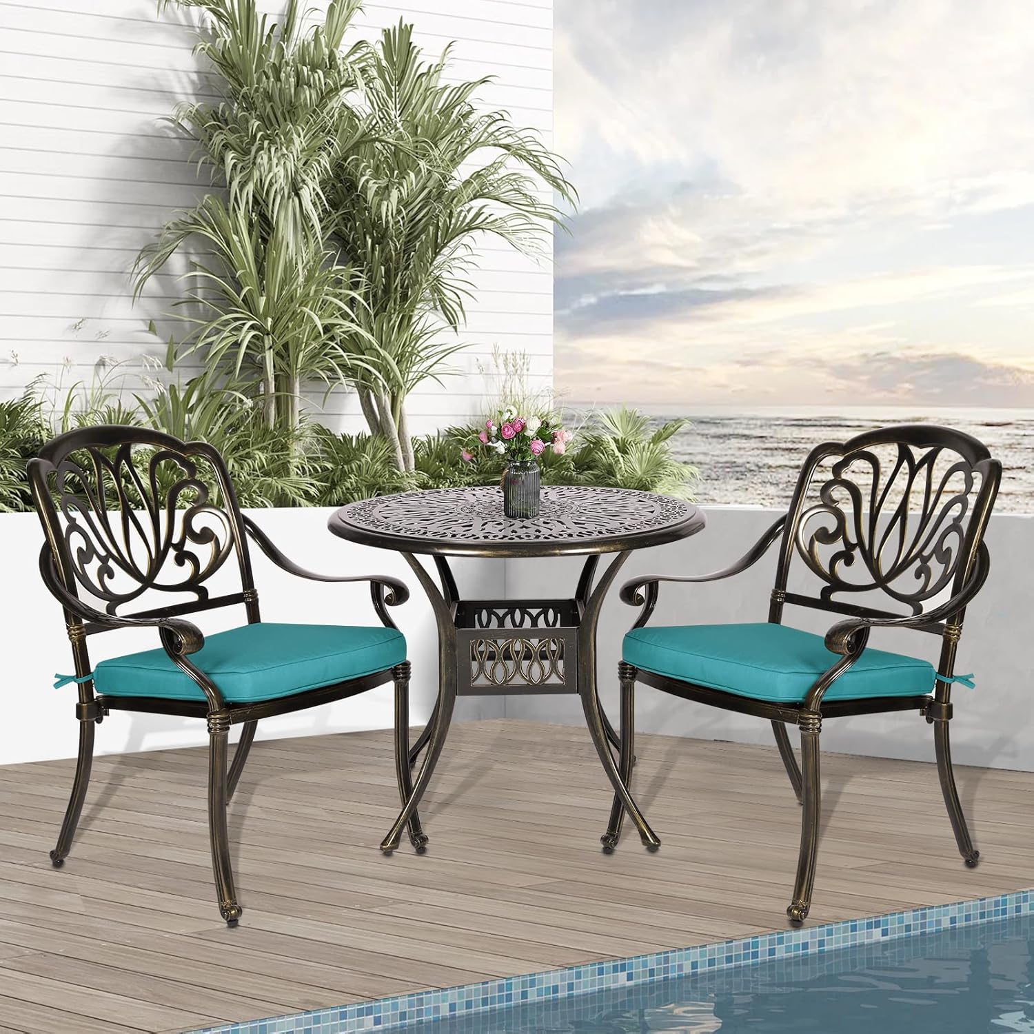 3-Piece Outdoor Patio Dining Set, All-Weather Cast Aluminum Patio Furniture Set for Backyard Garden Deck with 2 Cushioned Chairs and 35.4” Round Table, 2" Umbrella Hole, Ocean Blue