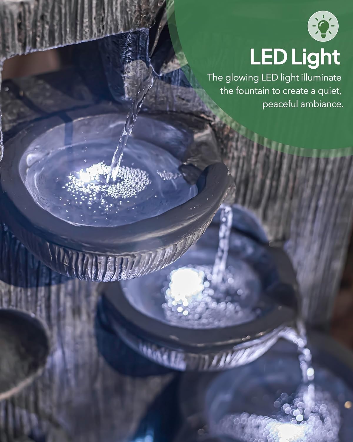 - 【LED Light】 This flowing water fountain features built-in lights that create a cozy atmosphere. It is perfect for outdoor decoration and suitable for a porch, backyard, garden, or lawn.