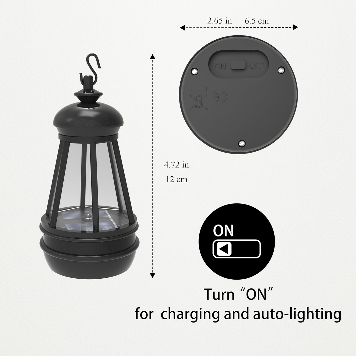 - Easy Operation: For the first use, turn the switch to “ON”, simply leave it charging in the sun (in case the energy runs out after a long period of time out of the sun during transportation), and it will automatically light up at dusk. Note the switch must be ON when charging