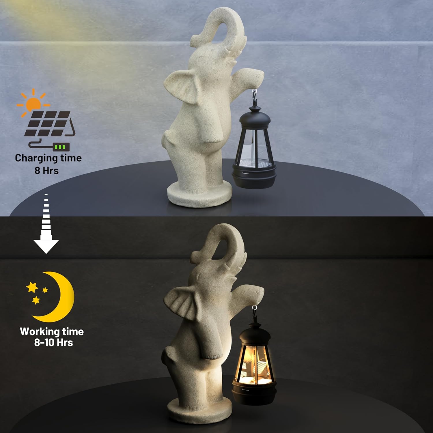 - Durable Material: Be made of high-quality resin to withstand various weather conditions without cracking or fading. Equipped with a solar charging panel, it converts solar energy into electrical energy during the day and stores it in rechargeable batteries for night glowing
