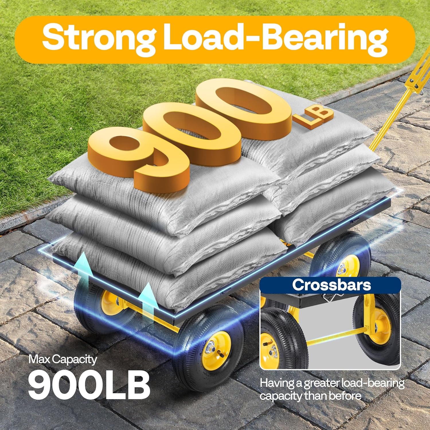 - POWERFUL LOAD AND LARGE CAPACITY: Boasting a generous 38-inch x 20-inch wide heavy-duty, rust-proof iron bed, this cart can effortlessly carry up to 900 lb; The crossbars between two tires improve stability and load-bearing capacity; Whether you use this yard wagon to carry planting tools or equipment, or load wood, it will satisfy all your needs; Note: To prolong its life, long-term heavy loading is not recommended)