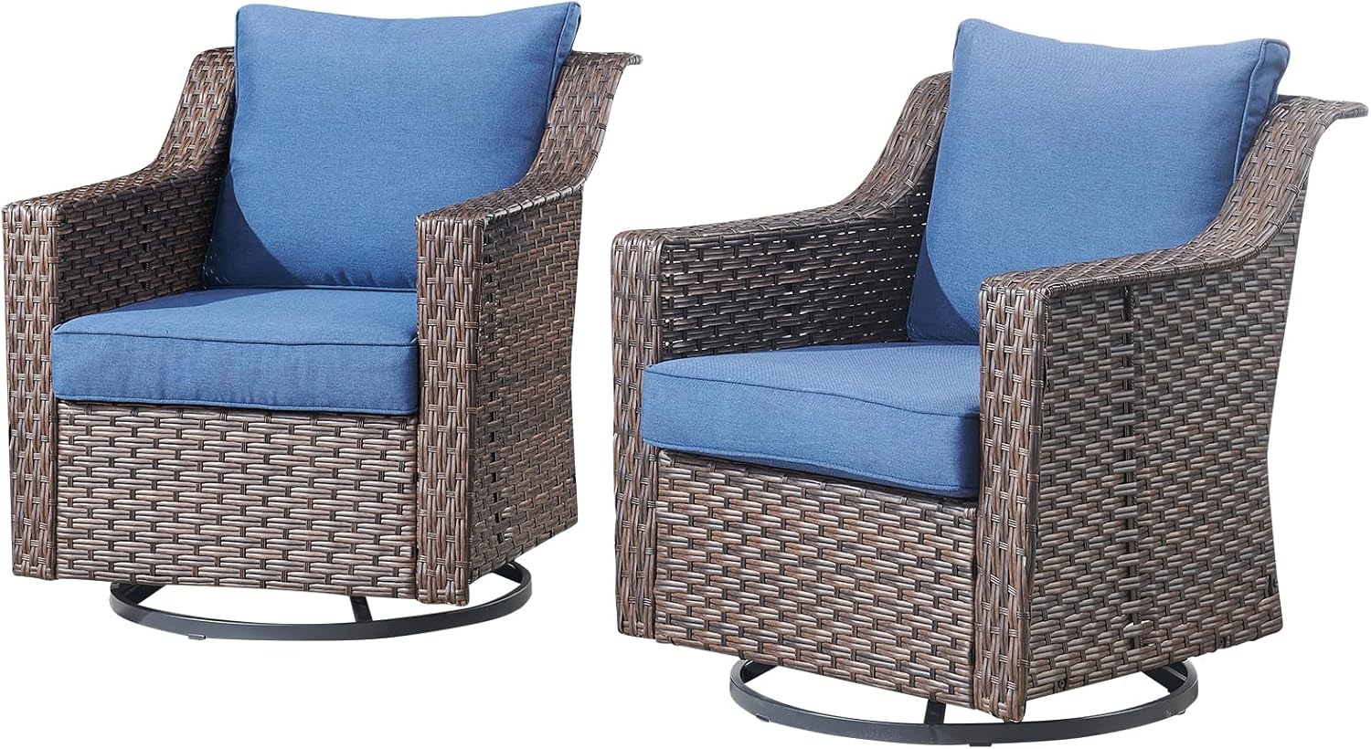 Outdoor Patio Wicker Swivel Chairs - Set of 2 Outside Resin Rattan Rocker Glider Gliding Chair Rocking Armchairs for Front Porch Balcony Backyard Yard Deck Poolside Apartment – Brown/Blue