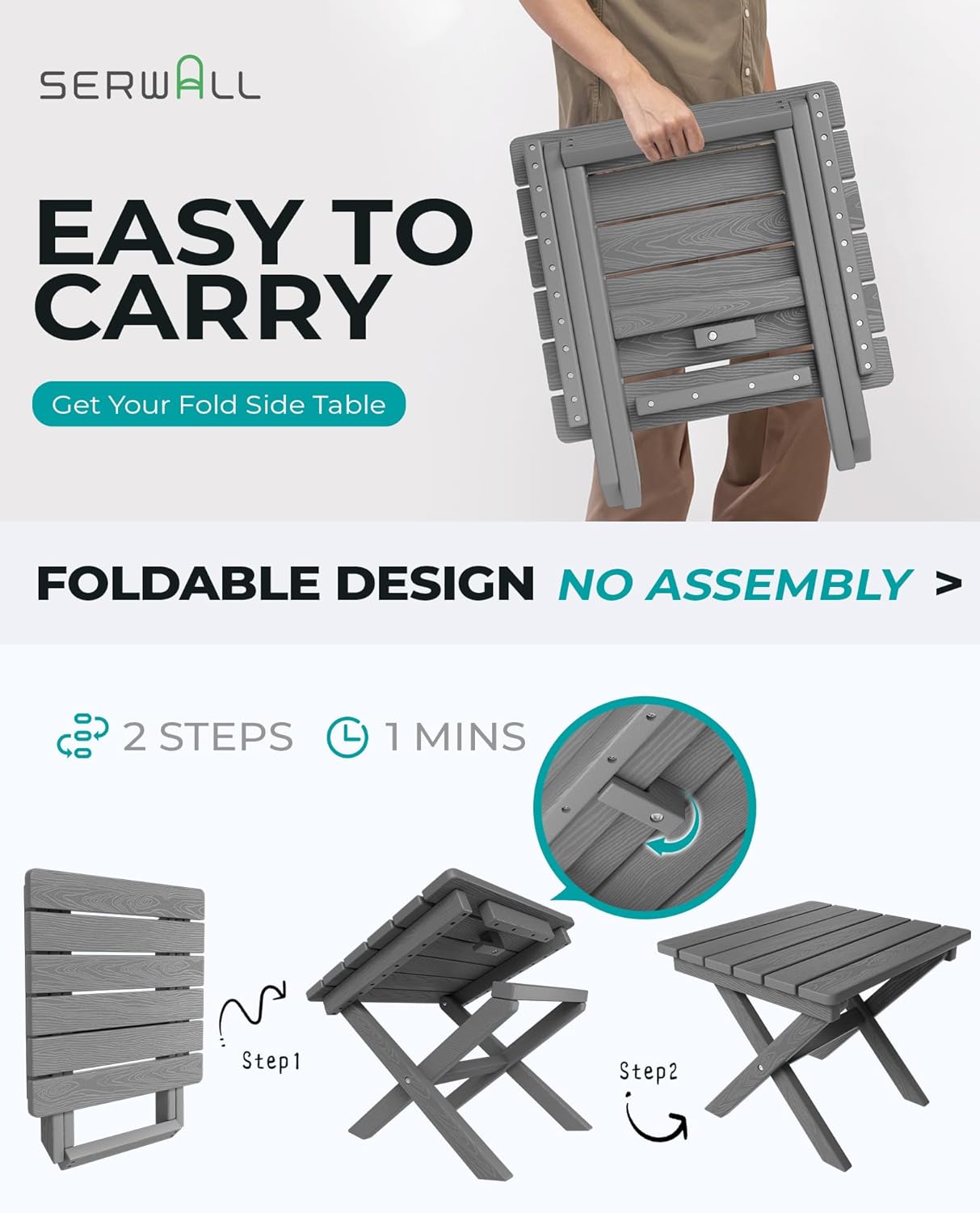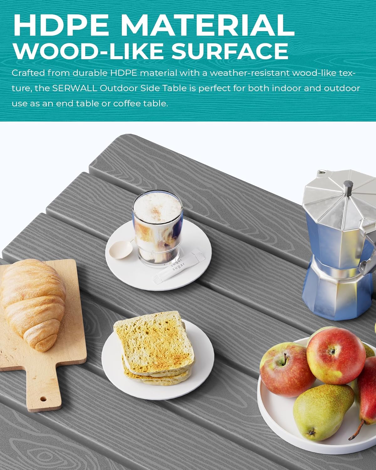 - [Premium Wood-Textured Surface] Offering the aesthetic appeal of wood without the upkeep, the SERWALL Side Table features a wood-textured HDPE surface that adds an elegant and natural touch to your outdoor decor.