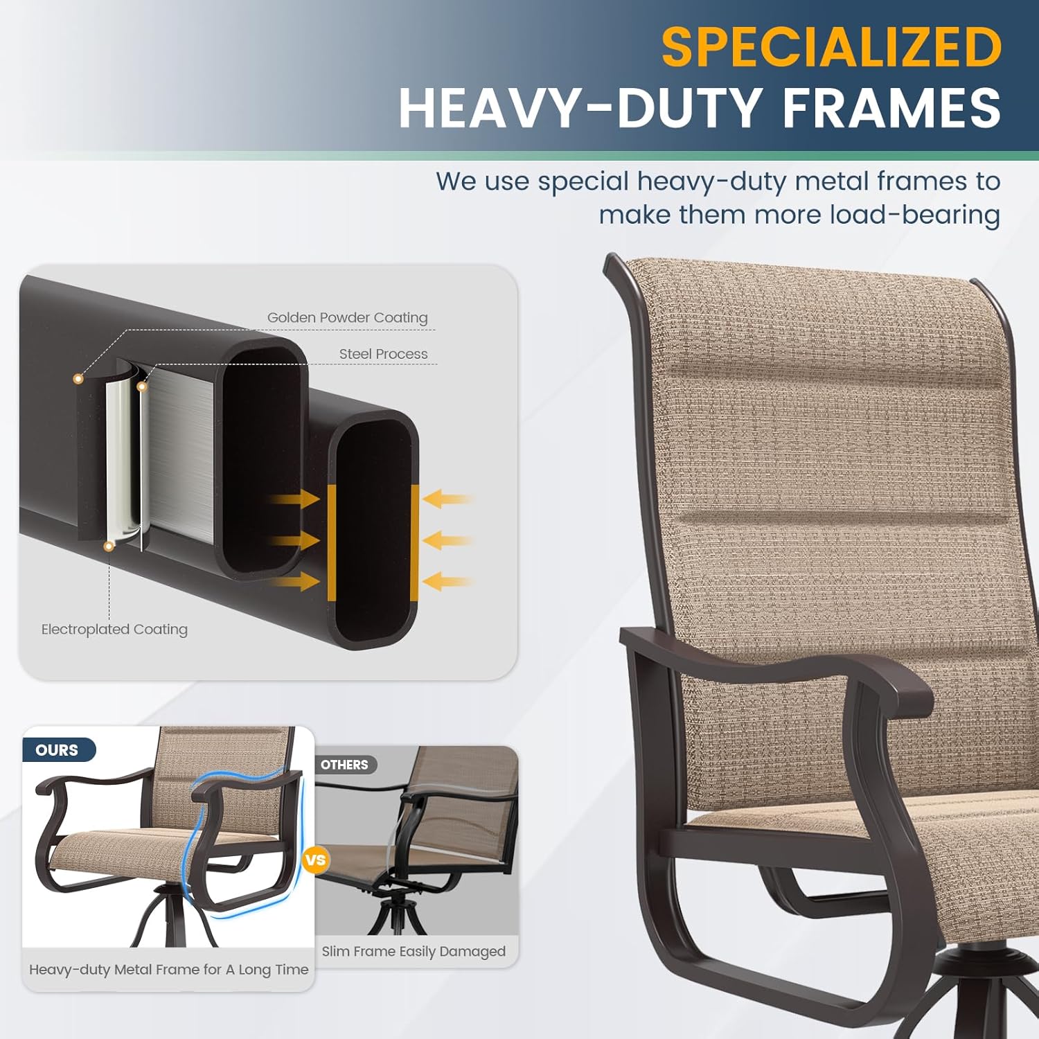 - 【STURDY & WEATHERPROOF CONSTRUCTION】Our patio furniture chair frame is made of powder coated high density metal that resists rust and corrosion and is stronger and more sturdy. Heavy-duty round swivel base gives the swivel rocker chair superb stability and can hold up to 400 pounds.