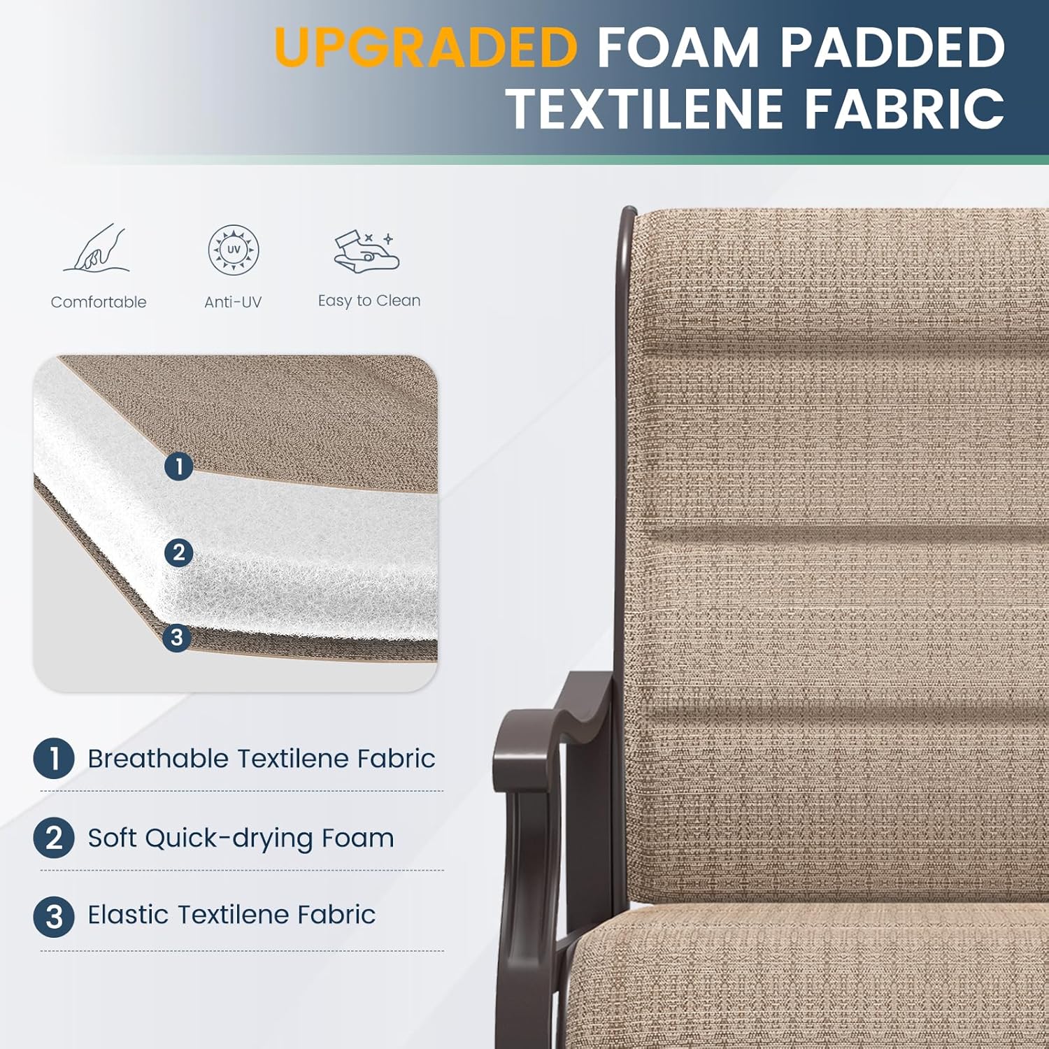 - 【COMFORTABLE PADDED TEXTILENE FABRIC】Our swivel patio chairs are made from a unique padded textile fabric that makes them softer and more comfortable than ordinary chairs while ensuring good breathability. You'll love the soft touch and the comfort of sitting for long periods of time without pains!