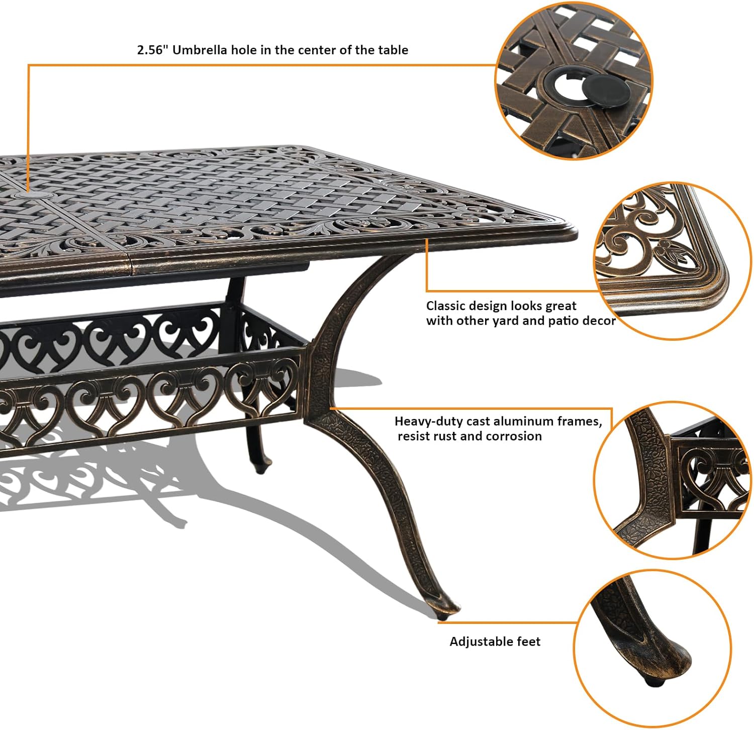 5 Piece Outdoor Patio Dining Set, All-Weather 58.66" Cast Aluminum Table and Chairs Set of 4, Bistro Set Outdoor with Umbrella Hole for Garden, Porch