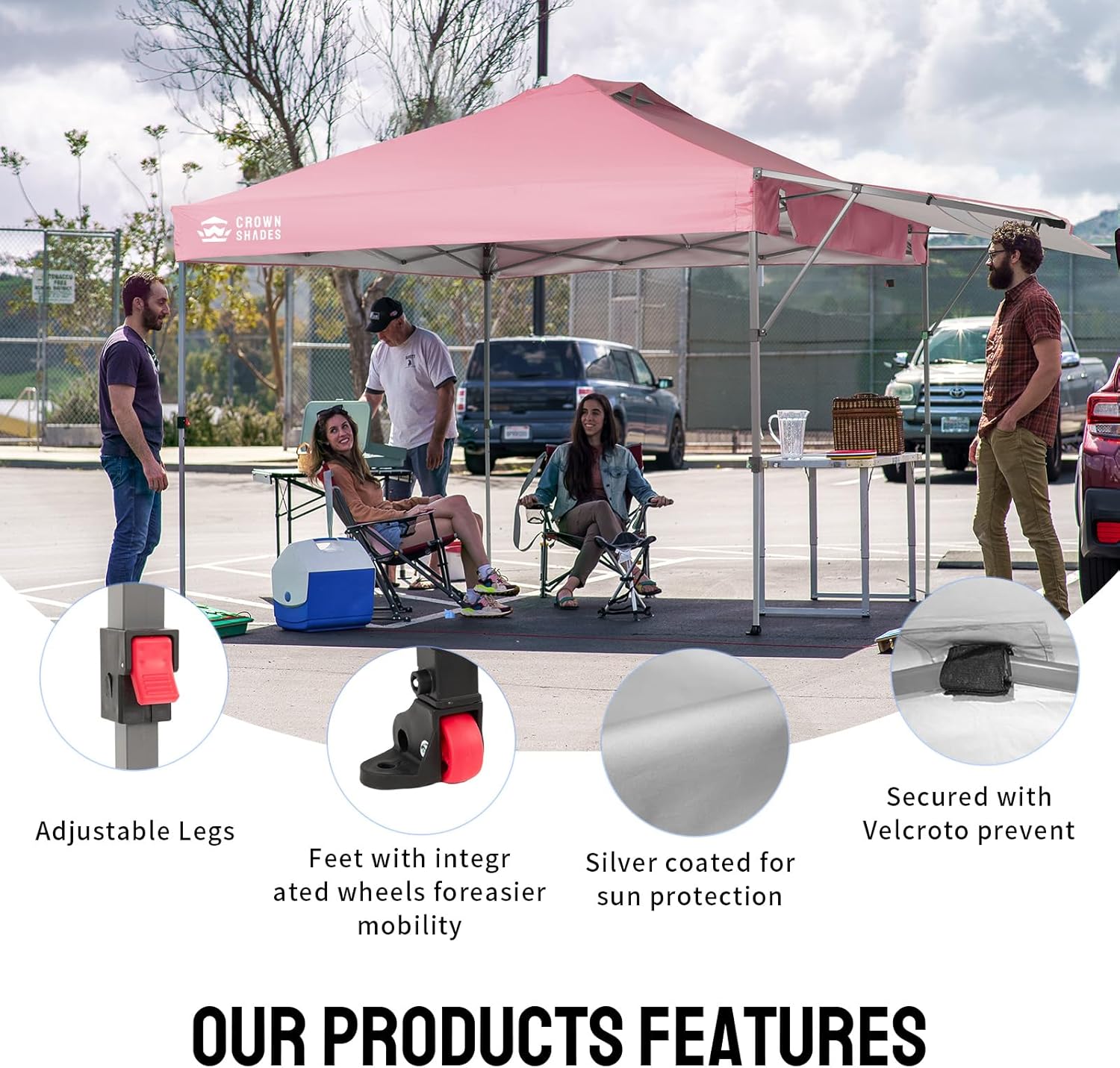 - EASIEST SET UP: Our canopy tent features patented one-push center lock technology, which securely locks all four poles with a single push at the central hub. Then, use the soft, pinch-free buttons to adjust the leg height from 3 positions. You can easily open or close the extendable awning to accommodate different shading requirements