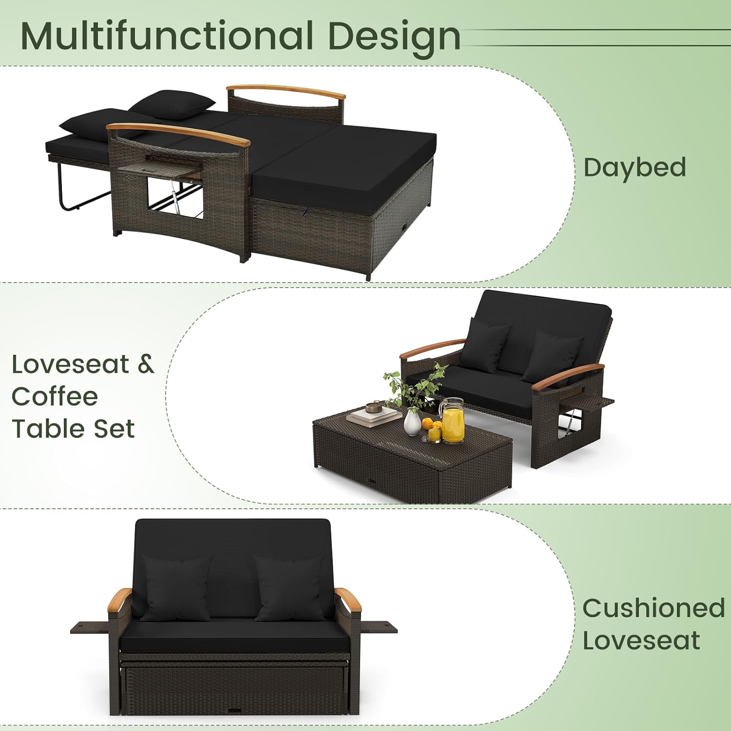 - Multifunctional Design: In addition to using it as a cushioned loveseat, this multi-purpose outdoor furniture set also serves as a daybed or loveseat and coffee table set, greatly meeting your different needs. Loveseat dimension: 31”-47.5” x 66” x 14”-36” (L x W x H). Ottoman dimension: 43.5” x 24” x 12” (L x W x H).