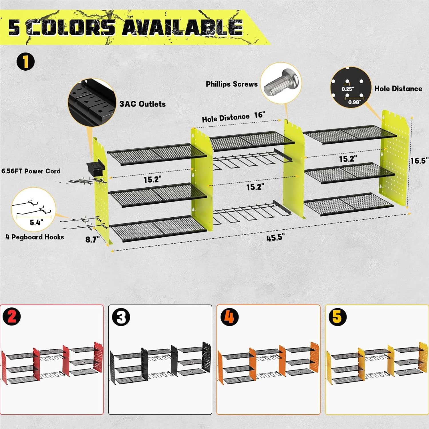 - Stable Structure with High Load Capacity: Made from heavy-duty upgraded carbon steel, this wall-mounted tool organizer is strong, stable, and resistant to deformation, supporting up to 200 lbs (40 lbs per shelf). It features easy assembly with included Phillips screws and screwdriver for a hassle-free installation