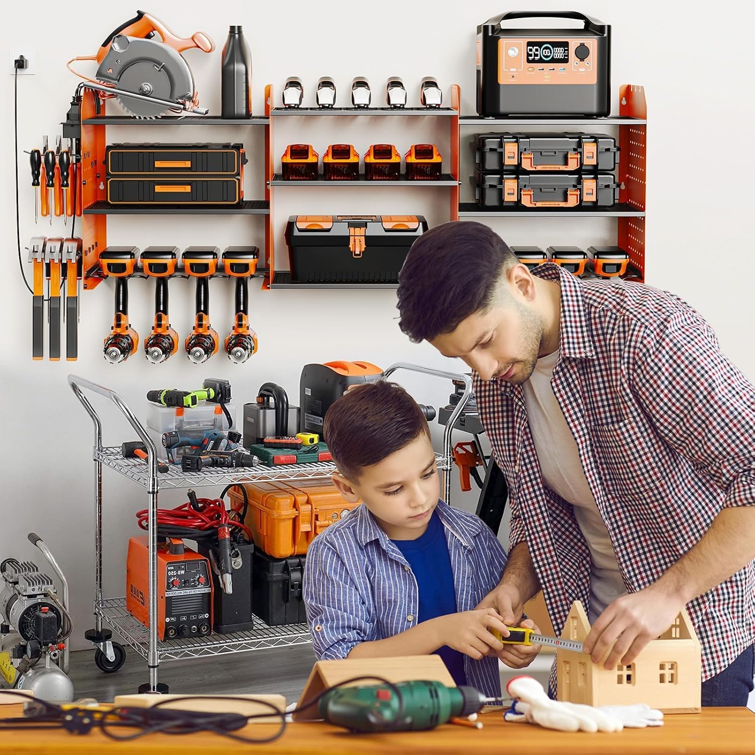 Power Tool Organizer with Charging Station Wall Mount, 3 Layer Expanded Heavy Duty Garage Organization, 45.5 Inch Length Garage Tool Storage, 8 Drills, 2 Assemble Method, Orange