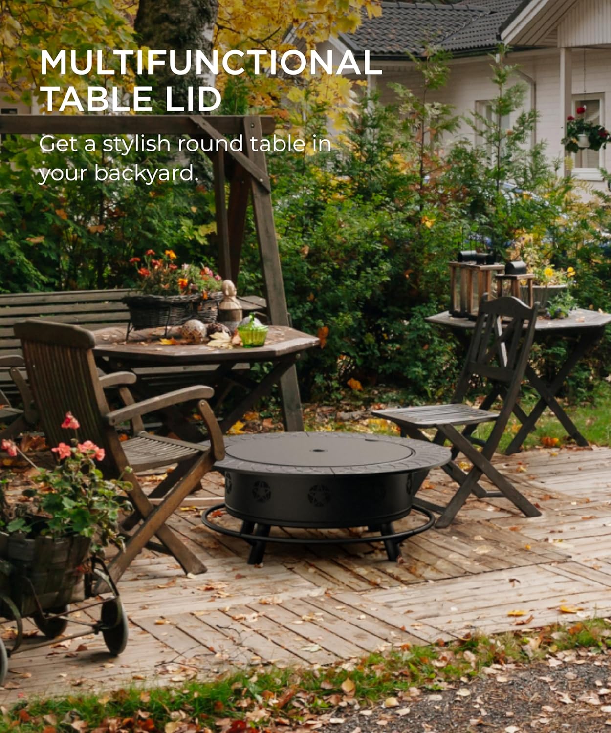 - 【3-IN-1 MULTIPURPOSE DESIGN】A 360-degree rotating roasting grill, one lid, and one poker are included with the SUNOUTLY outdoor fire pit. Enjoy the roast and bonfire when grills are fixed to the fire pit. You will get a 43-inch extra large round table to have a meal or drink coffee for 12–15 people when it doesn't make fire and cover the lid. Our wood fire pits serve three purposes: bonfire, BBQ, and table.