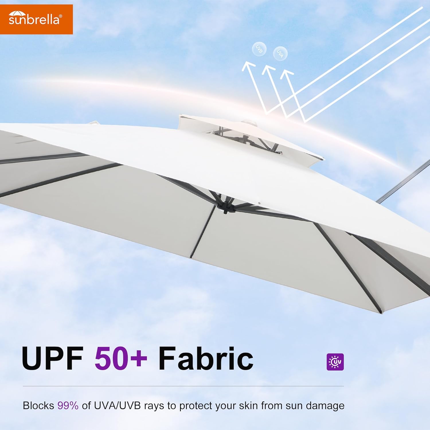 - Superior UV Protection: Featuring industry-leading fabric, this cantilever umbrella blocks over 98% of UV rays to effectively reduce skin cancer risks. 5 years of fade resistance, water and stain resistance.