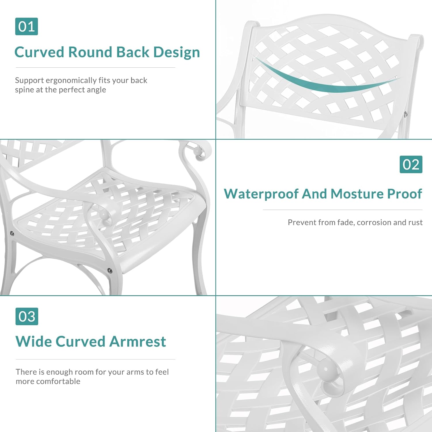- 【Dimensions】 - Our round table is 31"(Dia) x 29.5"(H), and each of 2 chairs is 22.4"(L) x 23"(W) x 32.5"(H), you’ll love how this furniture set uniquely accents your space. Quickly assemble so you can enjoy it in no time, all hardware, tools and instructions required are included for easy assembly. Over this summer to show off your new, stylish, cast aluminum dining set to everyone