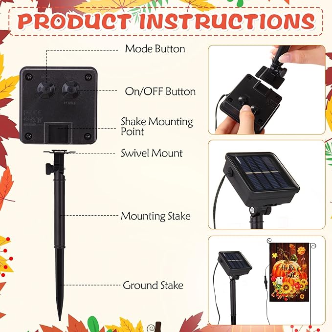 - Suitable Quantity: this set of 12 styles of outdoor garden flags comes with 16 solar cell ground plugs, 1 solar panel, 16 LED lights on each flag, powered by solar energy, avoid expensive electricity bills; ( Note: flagpole is not included