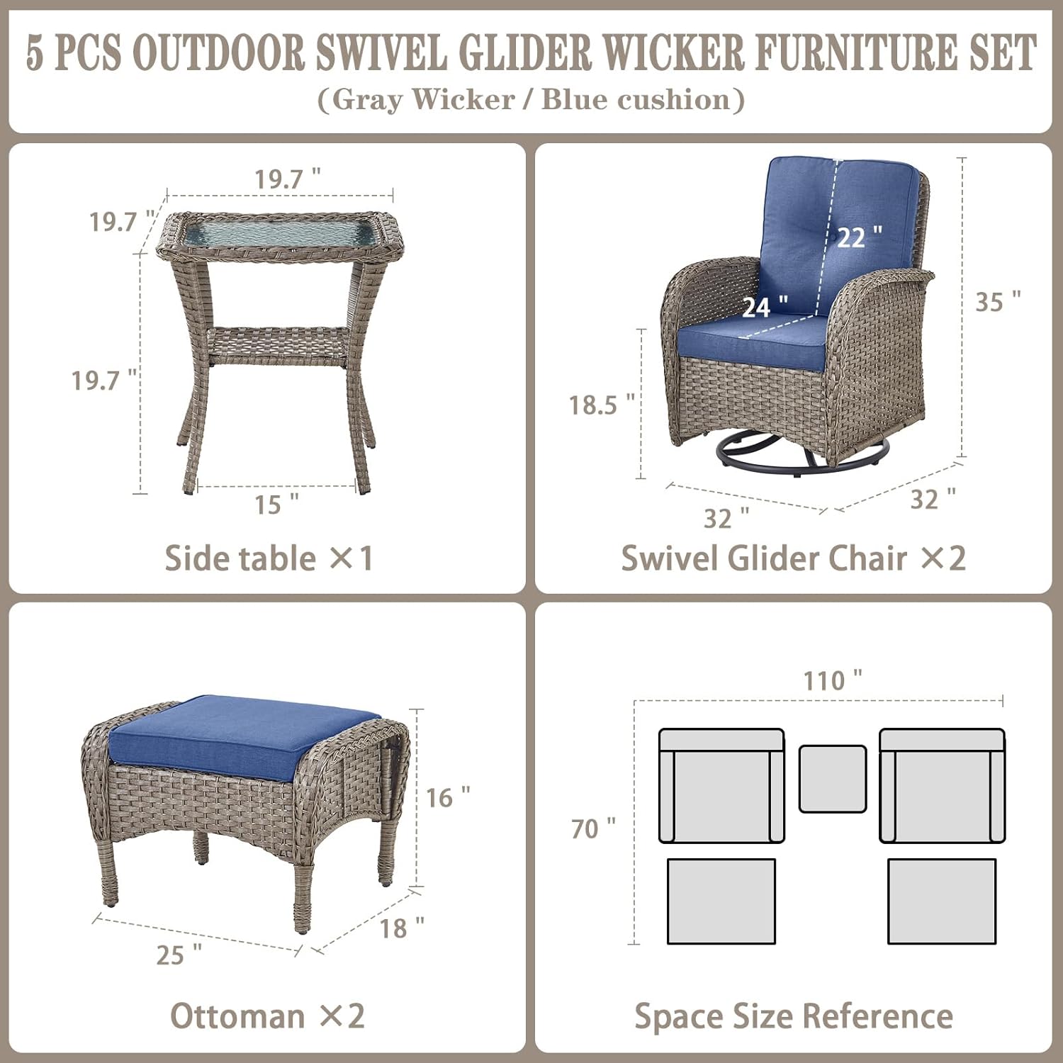 - 1.PATIO CONVERSATION SETS DETAILS: The 5 pcs patio furniture set includes 2 wicker swivel rocker chairs, 2 ottomans and 1 glass top side table, each chair has a weight capacity of 300 pounds and the side table has a weight capacity of 50 pounds. The brown color wicker with blue cushions in a simple and premium tone is perfect for decorating your patio, porch, balcony, sunroom and other outdoor spaces.