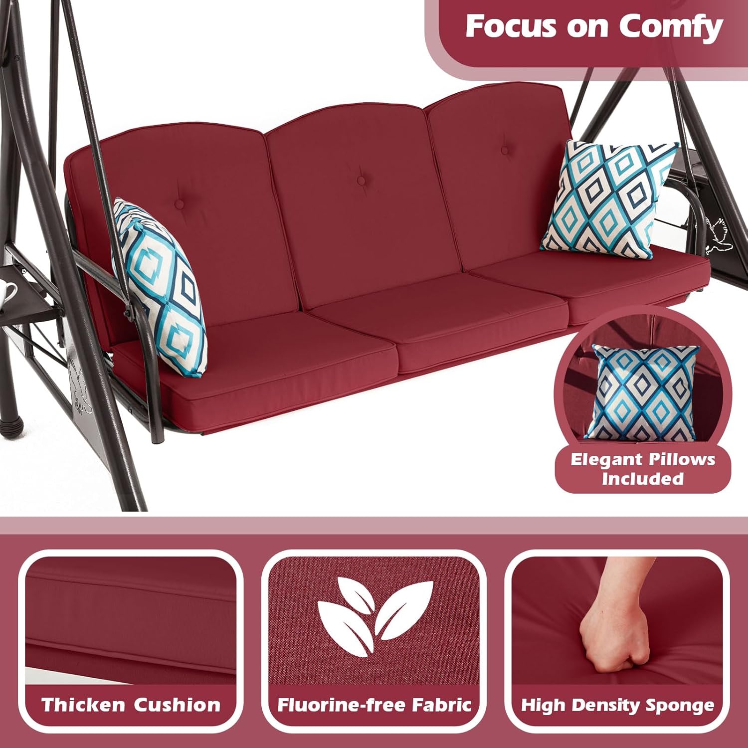 800LBS Patio Swing with Canopy 3 Seat Outdoor Porch Swing with Stand w/Cup Holder & Pillow Glider Chair Swing Bed for Patio Backyard Poolside (Red)