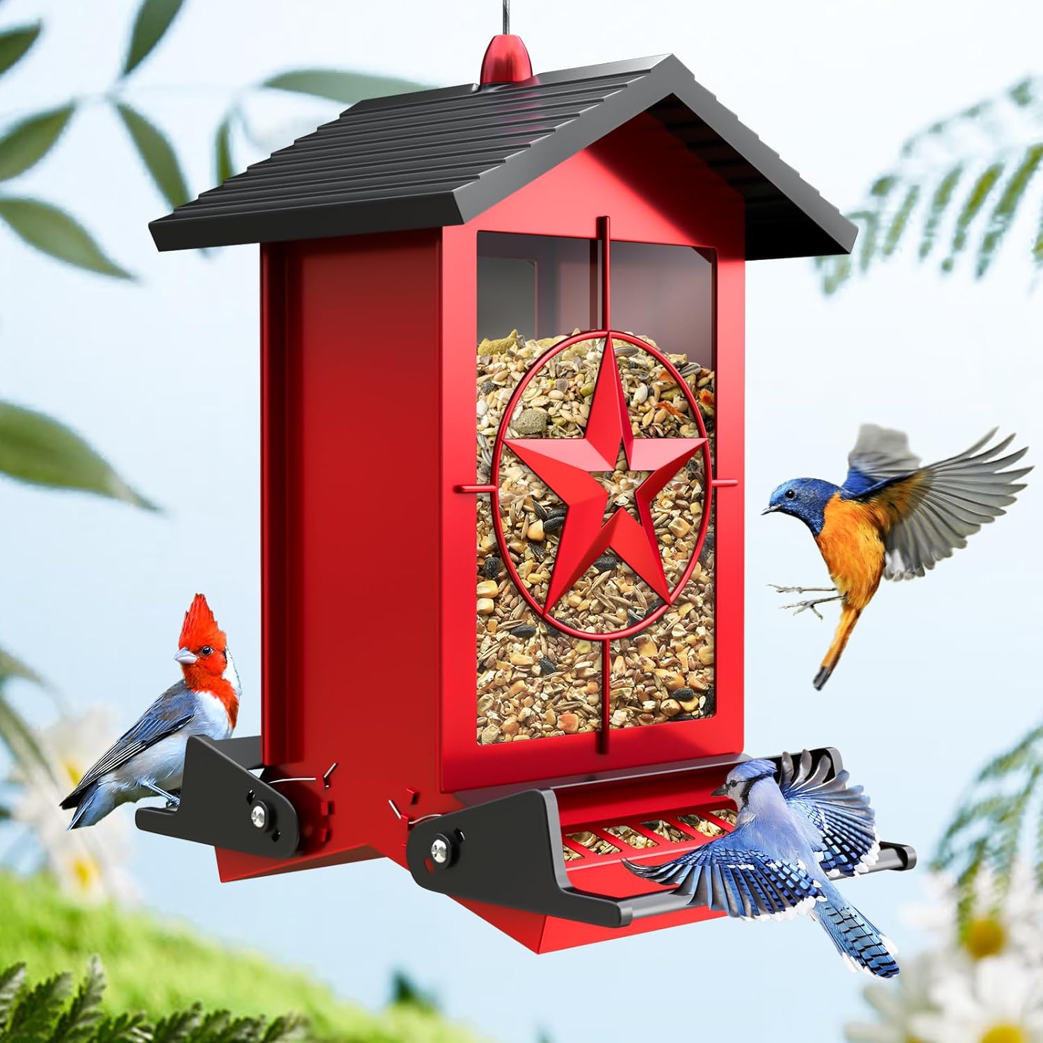 - All-Metal Design: The bird feeders for outdoors is crafted from sturdy metal resistant to chewing, you don’t have to worry about squirrels destroying your bird feeders. And this outdoor bird feeder suitable for all kinds of weather, ensures longevity and reliability, providing a robust feeding solution for your feathered friends.