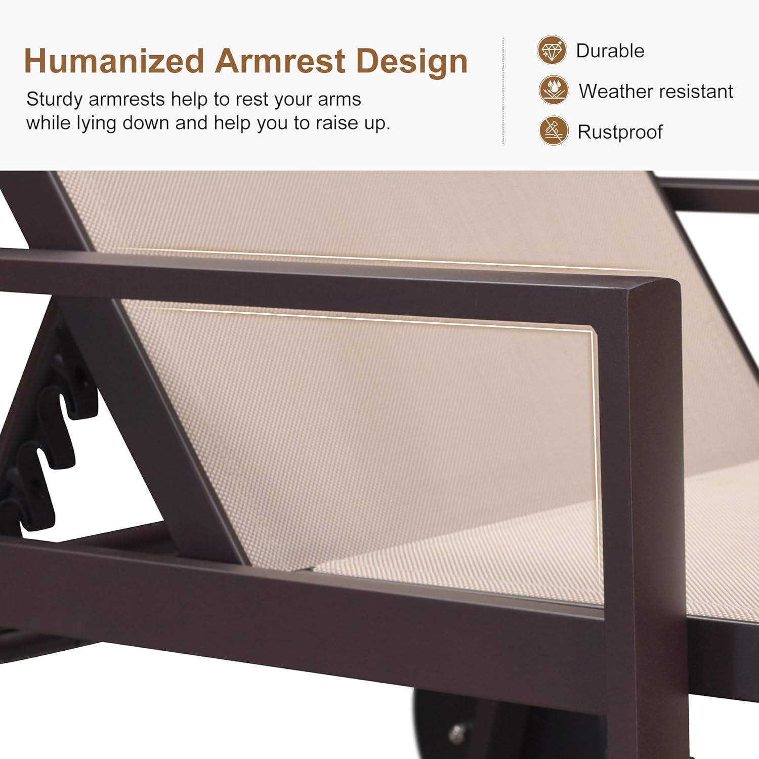 - HUMANIZED ARMREST: Feature two 20.09 "height humanized armrests, the lounge chairs for outside can relax your arms while lying down without pressure and get out of easily.