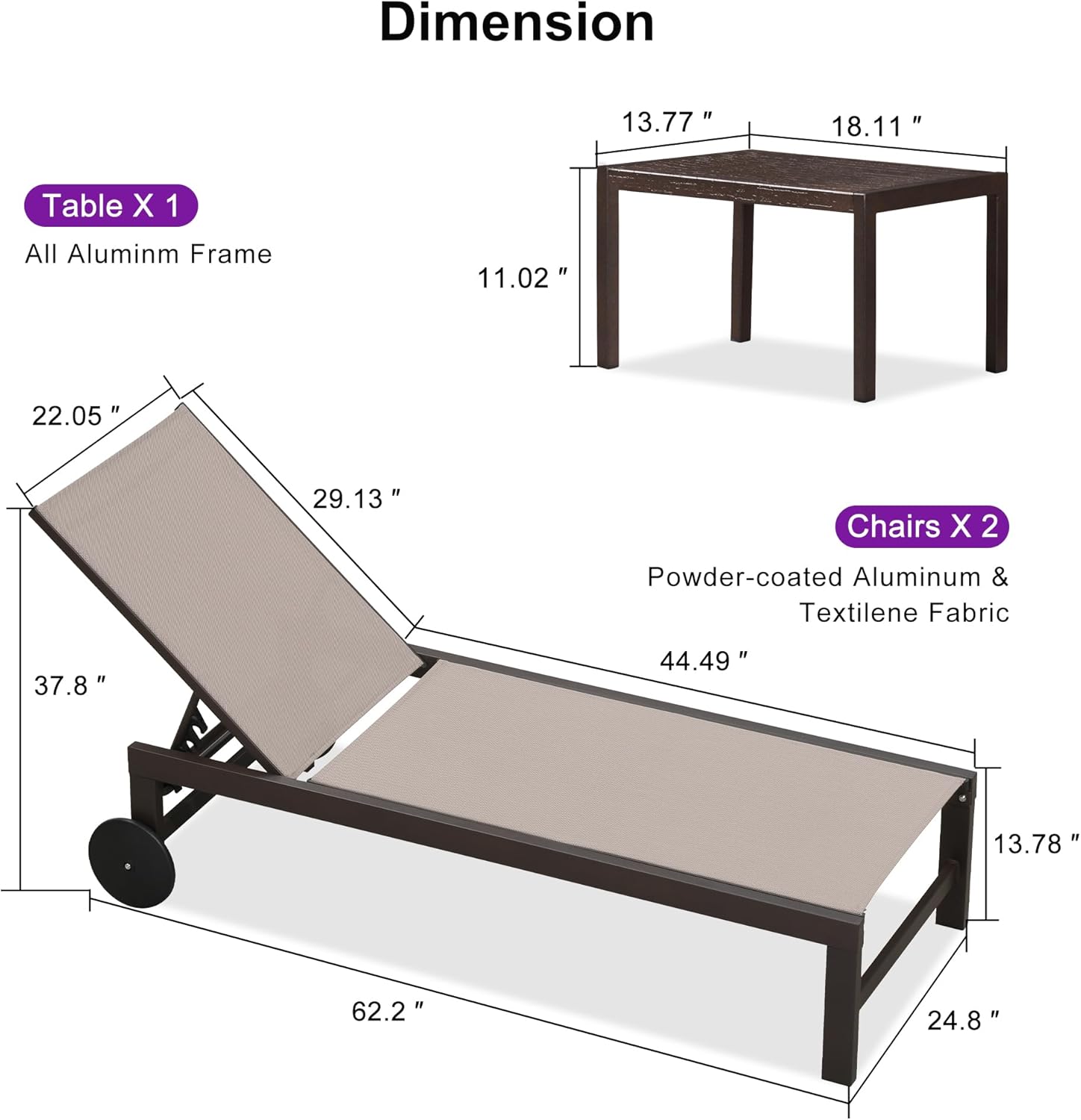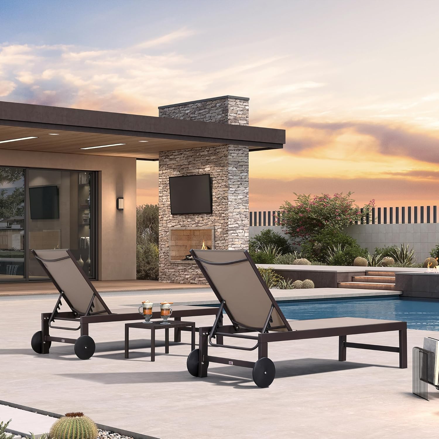 PURPLE LEAF Outdoor Chaise Lounge Chair Set of 3, Pool Lounge Chair for Outside, Aluminum Patio Chaise Lounger with Adjustable Backrest and Wheels for Deck, Outside, Lawn, Garden, Sand Beige