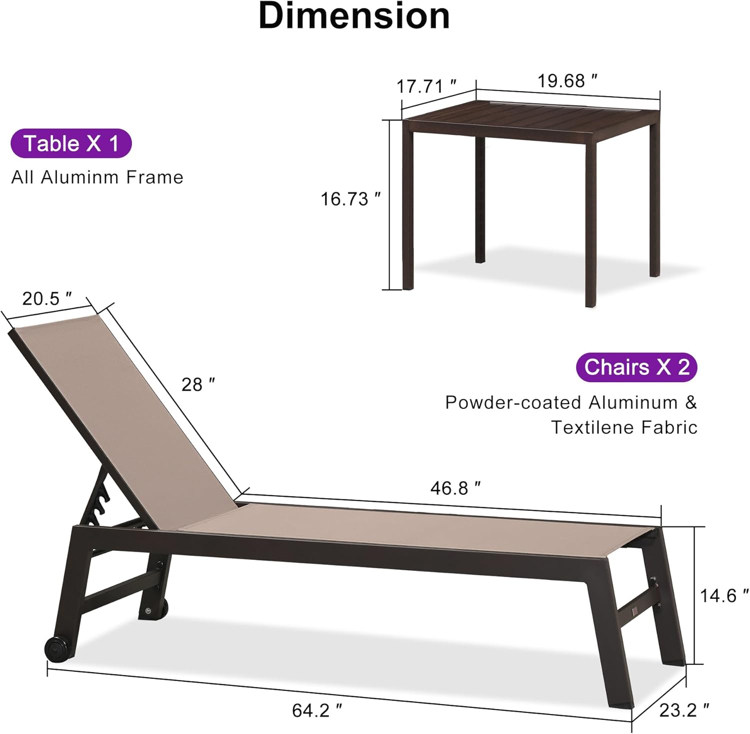 PURPLE LEAF Outdoor Chaise Lounge Chair Set of 3, Patio Lounge Chair for Outdoor, Aluminum Patio Chaise Lounger with Adjustable Backrest and Wheels for Outside, Lawn, Garden, Taupe