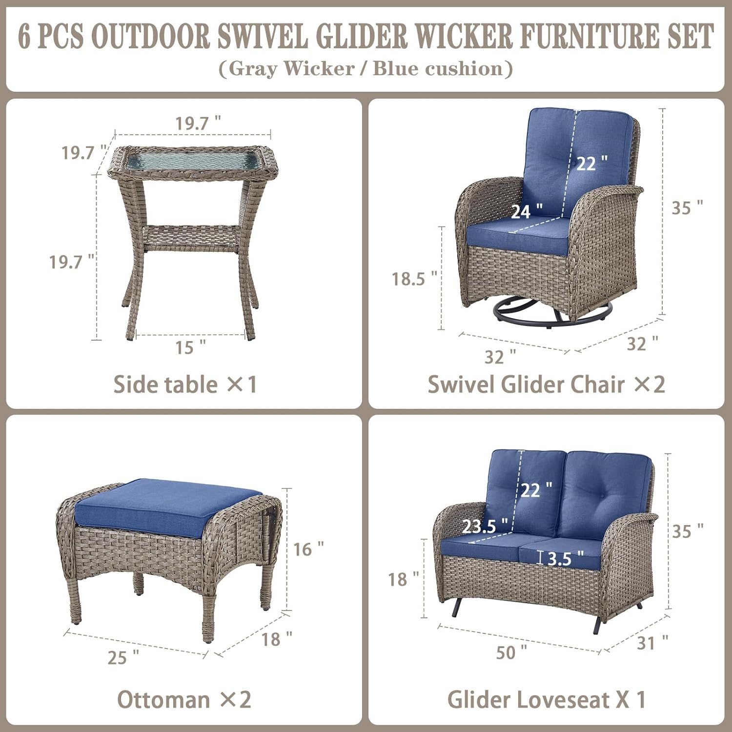 - Size : 6 PCS - Swivel Glider & Glider Loveseat