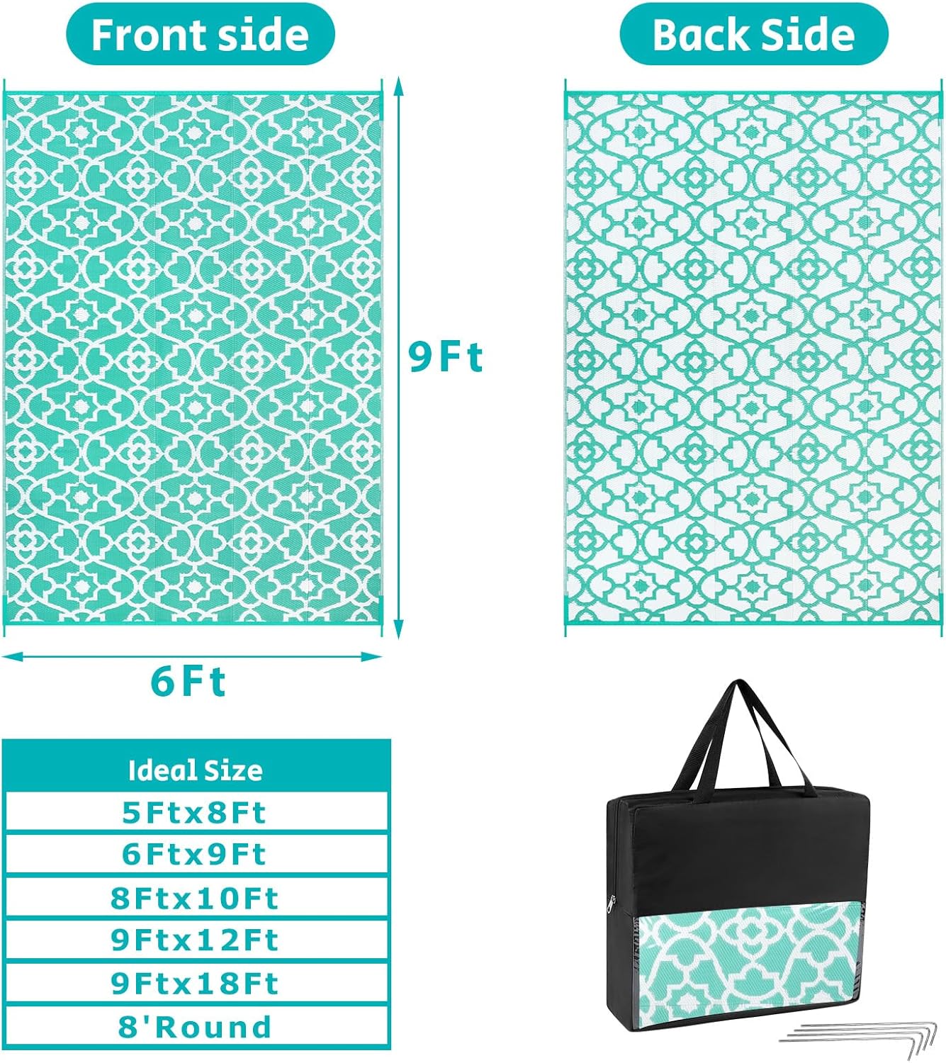 - XL Large Reversible Outdoor Rugs: Featuring a classic moroccan pattern on both sides, this rectangular 6x9 ft outdoor area rug allows you to instantly refresh your patio, porch, backyard, deck, RV campsite. And this outdoor deck rug is reversible, two-sided design allows you to have two different looks,both sides can blend perfectly with nature and look very full and comfortable.