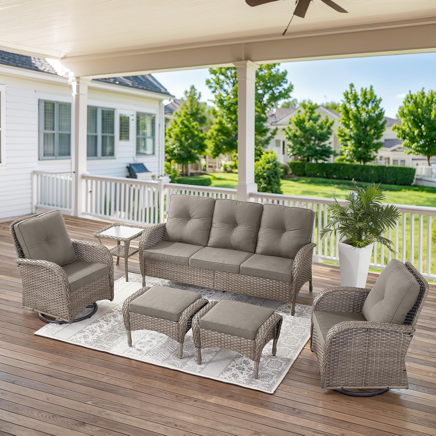 - 4.LUXURIOUS OUTDOOR RETREAT ENSEMBLE: Relax in the beautiful outdoors with this perfect 6 pieces patio glider furniture set. Our patio swivel rocker chair set with high quality foam cushion, comfortable and soft rebound good. The cushion cover is made of olefin outdoor water-resistant fabric. The seat and backrest are made of beautifully woven wicker coupled with ergonomic design, making it a classic upgrade for any porch, deck or patio.