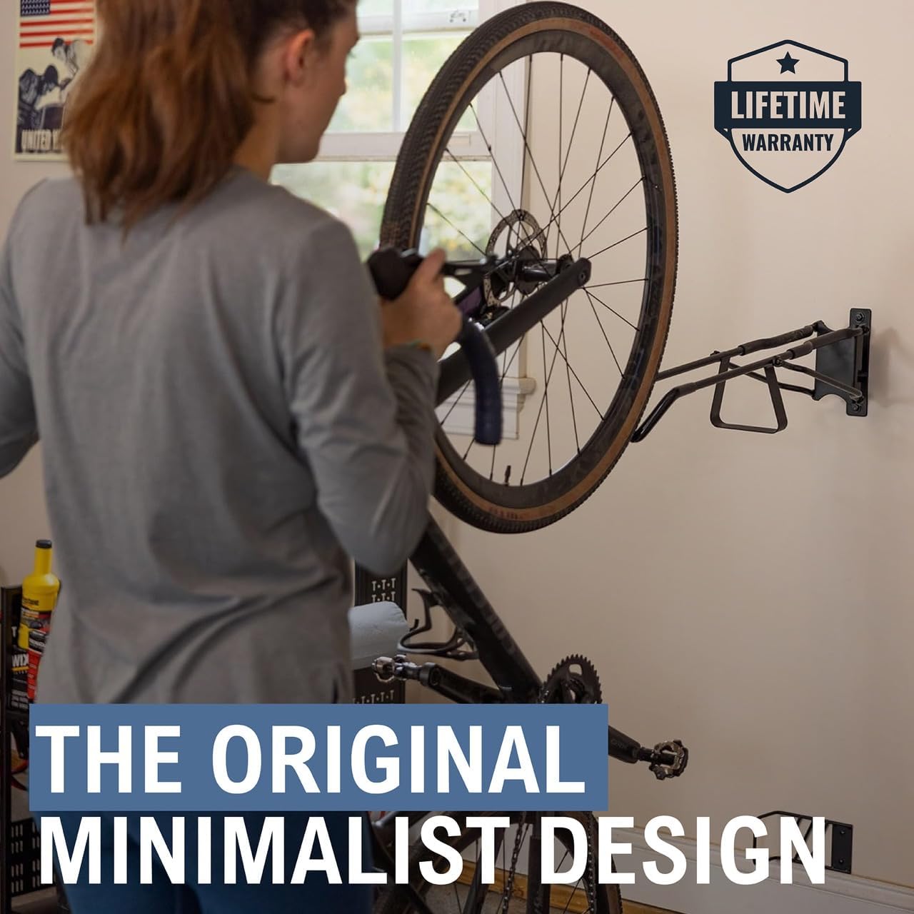 - Bike Rack Wall Mount: Organize road and gravel bikes flat against the wall with this vertical bike rack. It holds all bikes with tires between 18 mm and 45 mm wide. From your lightest carbon frame to your heaviest e-bike, keep your bike adventure-ready.
