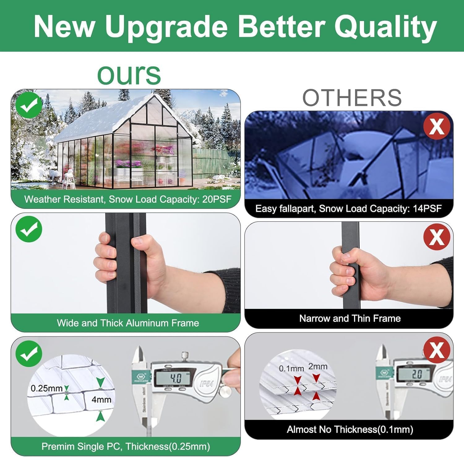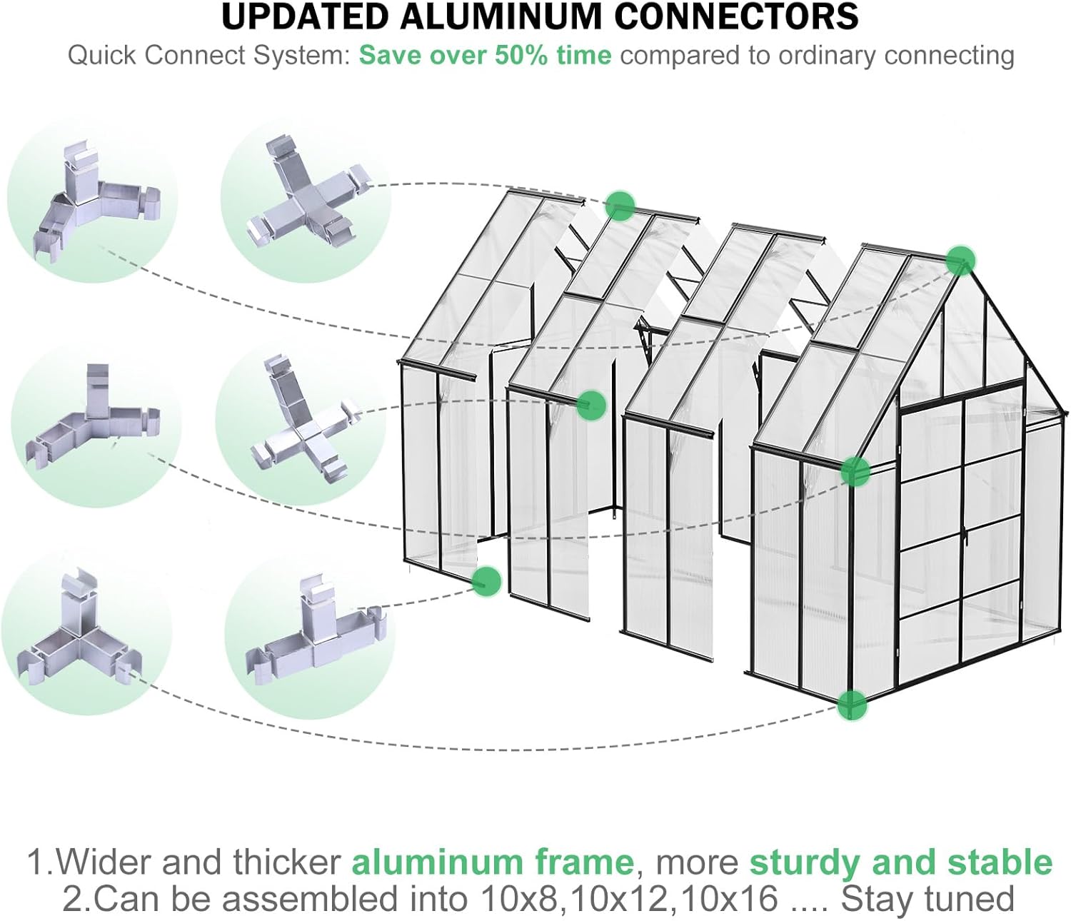 - Sturdy Frame: Our greenhouse kit boasts a robust rust-resistant aluminum frame designed to withstand various weather conditions. 2 skilled enthusiasts can assemble this greenhouse kit within just 4-6 hours. Introducing patented technology, Easy assembly, saving you 50% of your time. Gone are the days of tedious setups. With a simple push and locking screw, our Quick Connect ensures a reliable, secure, and swift link-up. It can also support snow loads of up to 20PSF