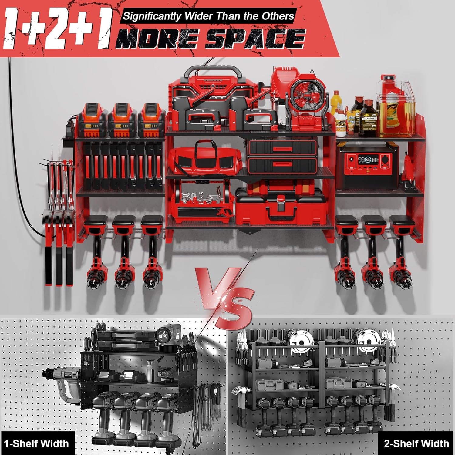 - Expanded Width to Maximized Storage: The Xankzi power tool organizer wall mount with charging station features a patented wide design in its 2 central shelves, perfect for storing more tools, especially longer items like chainsaws. Measuring 45.6" wide, 16.5" high, and 8.7" deep, this sturdy and space-efficient power tool storage rack keeps your tools organized