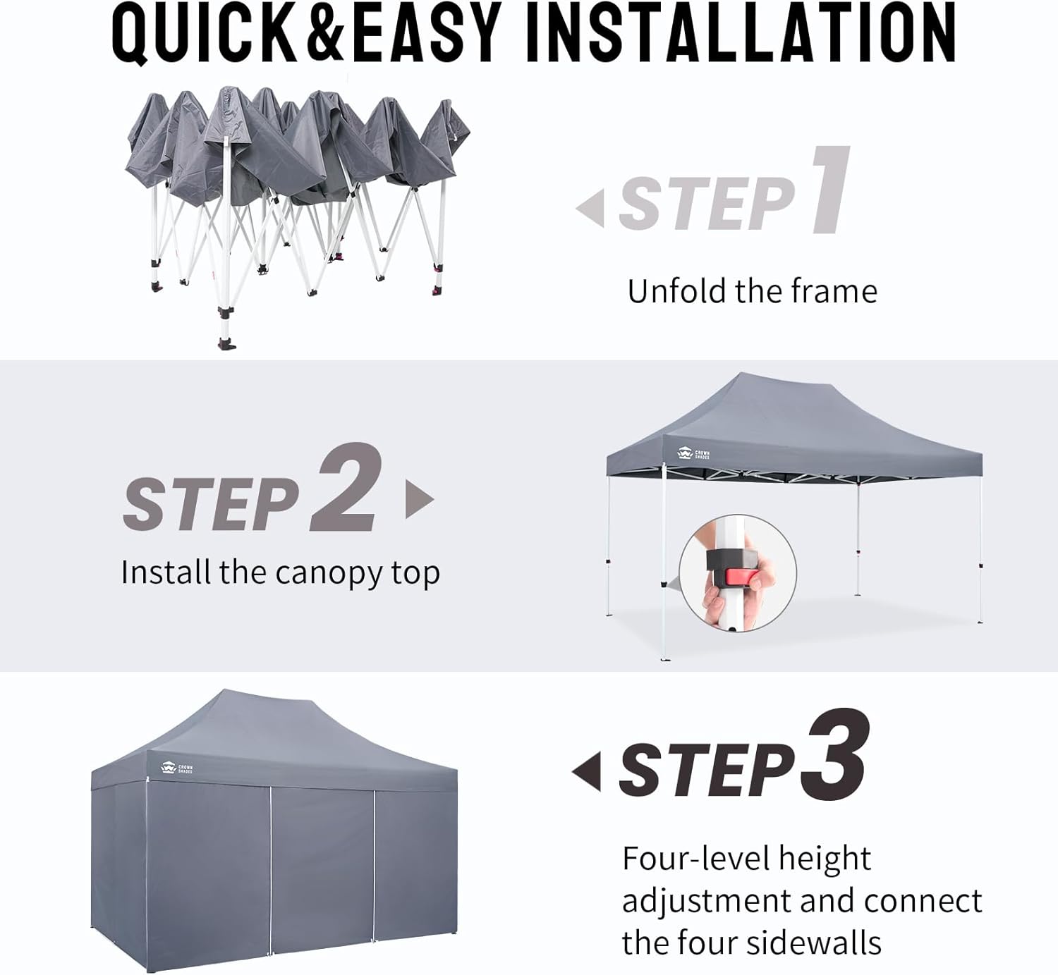 CROWN SHADES 10x15 Pop Up Canopy Tent, Thicken Frame Commercial Heavy Duty Tent with 4 Sidewalls 8 Stakes & 4 Sandbags & 4 Ropes, Outdoor Canopies for Events, Parties,Grey