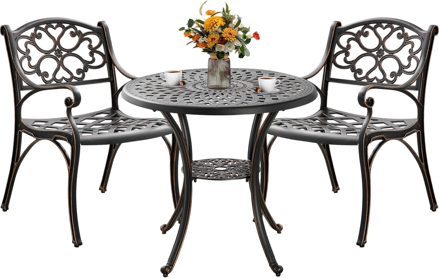 Bistro Set 3 Piece Outdoor Cast Aluminum Patio Bistro Set Patio Set Metal Bistro Table and Chairs Set of 2 with Umbrella Hole for Deck, Gardens, Bronze (Flower Backrest)
