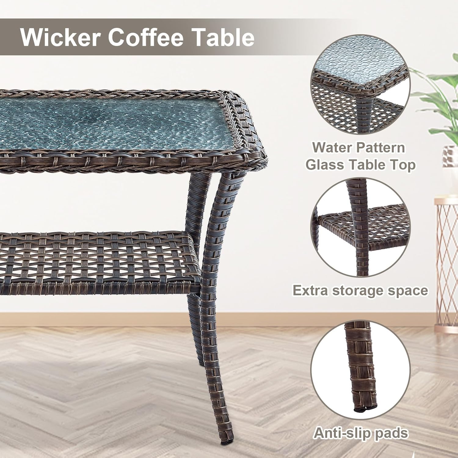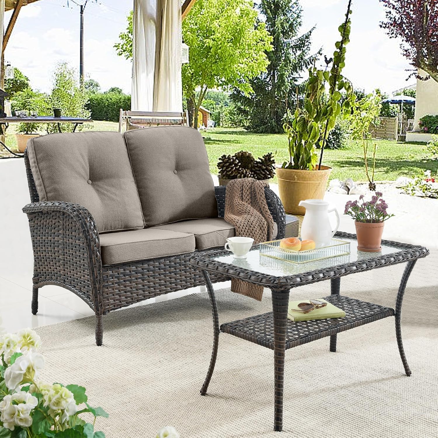 - 3.All-weather PE Wicker Furniture: Featuring a long-lasting woven finish, this style is not only incredibly durable but also provides a versatile appearance. The handcrafted details of this material allow this patio furniture set to blend seamlessly with your outdoor decor.