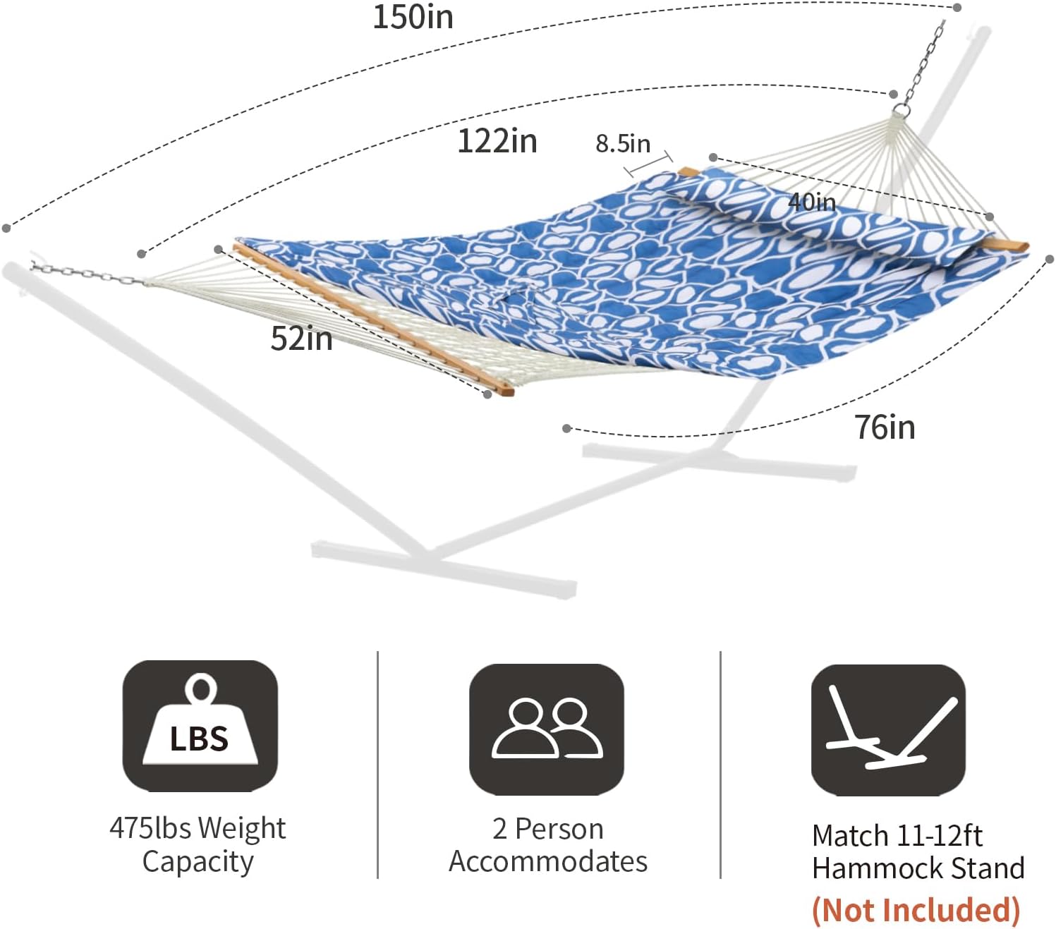 Outdoor Double Hammock with Hardwood Spreader Bars, Large Rope Hammock with Polyester Pad and Pillow, 475 LBS Capacity for 2 Person Patio Backyard Poolside - Blue Printing