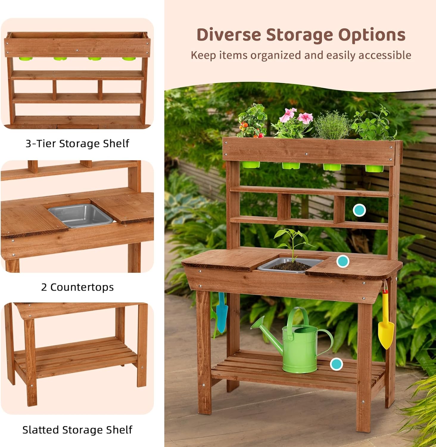 OOOK Potting Bench with Removable Sink, Potting Benches for Outside, Mud Kitchen for Kids Outdoor with Gardening Tools, Watering Can, Flower Pot, Ideal Gift for Boys and Girls 3+, Solid Fir Wood