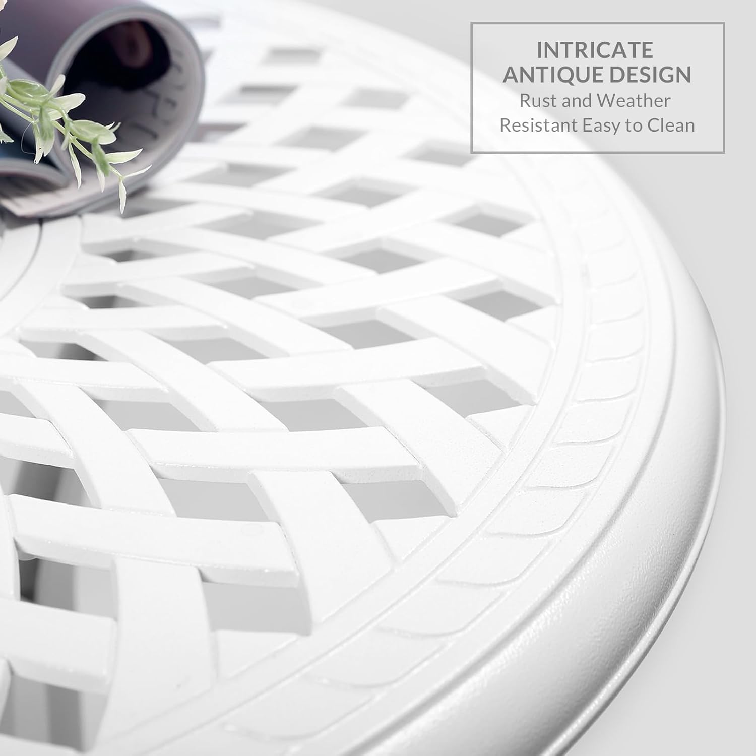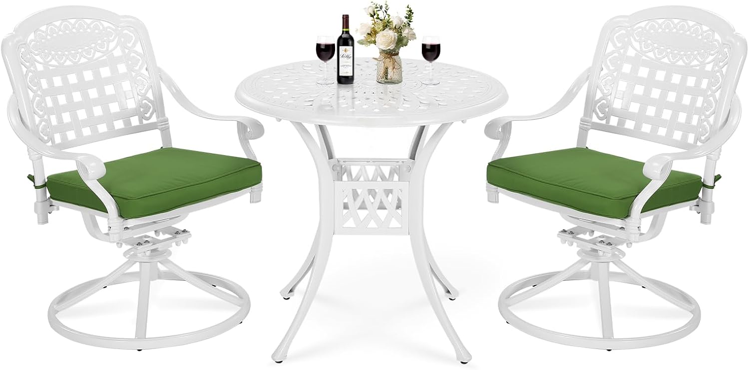 - 【STYLISH APPEARANCE】 - This 3-Piece White Dining Set includes 2 swivel rocker chairs and 31" round cast table. Elegant cast accents scroll across the chairs and table top, adding a level of sophistication and craftsmanship to the collection. Perfect addition to your patio, yard, deck, or porch.