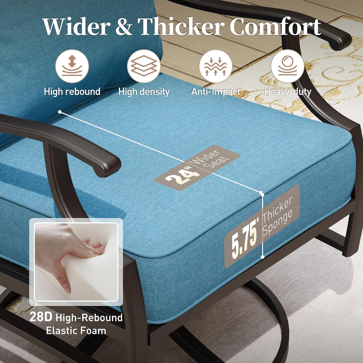 - LUXURIOUS 5.75" EXTRA THICKER CUSHION: This metal patio swivel rocker chairs comes with a 5.75-inch extra thick soft cushion filled with 28D density sponge with high resilience for comfortable sitting. Enjoy a comfortable ride even if you use it for a long time, and say goodbye to the worries of collapsing seat cushion