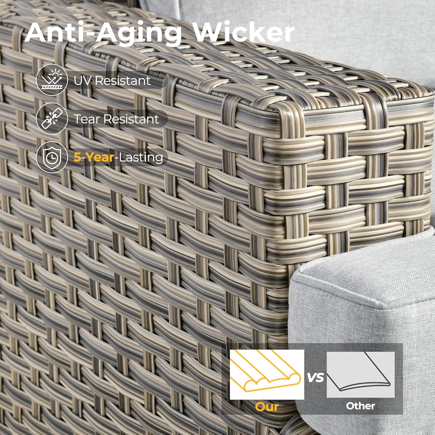 - All Weather & Durable: Selected anti-ageing treated thicken PE wicker rattan for UV resistant, wear resistant and all weatherproof. 3D strengthen and widen design for extended service life,twice service life as others