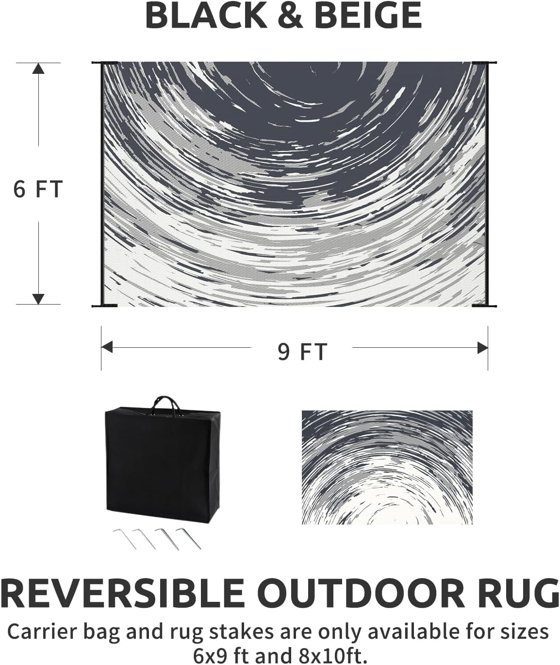 • RV traval&Camping: This camper must haves outdoor rug is ideal for picnics, gatherings, and RV trips! The lightweight outdoor camping carpet with foldable lines is easy to carry and saves space. Includes an extra carry bag and rug stakes for 6x9 ft, 8x10 ft and 9x12 ft. Grass-friendly, durable, and easy to clean, this outdoor rug enhances outdoor adventures.