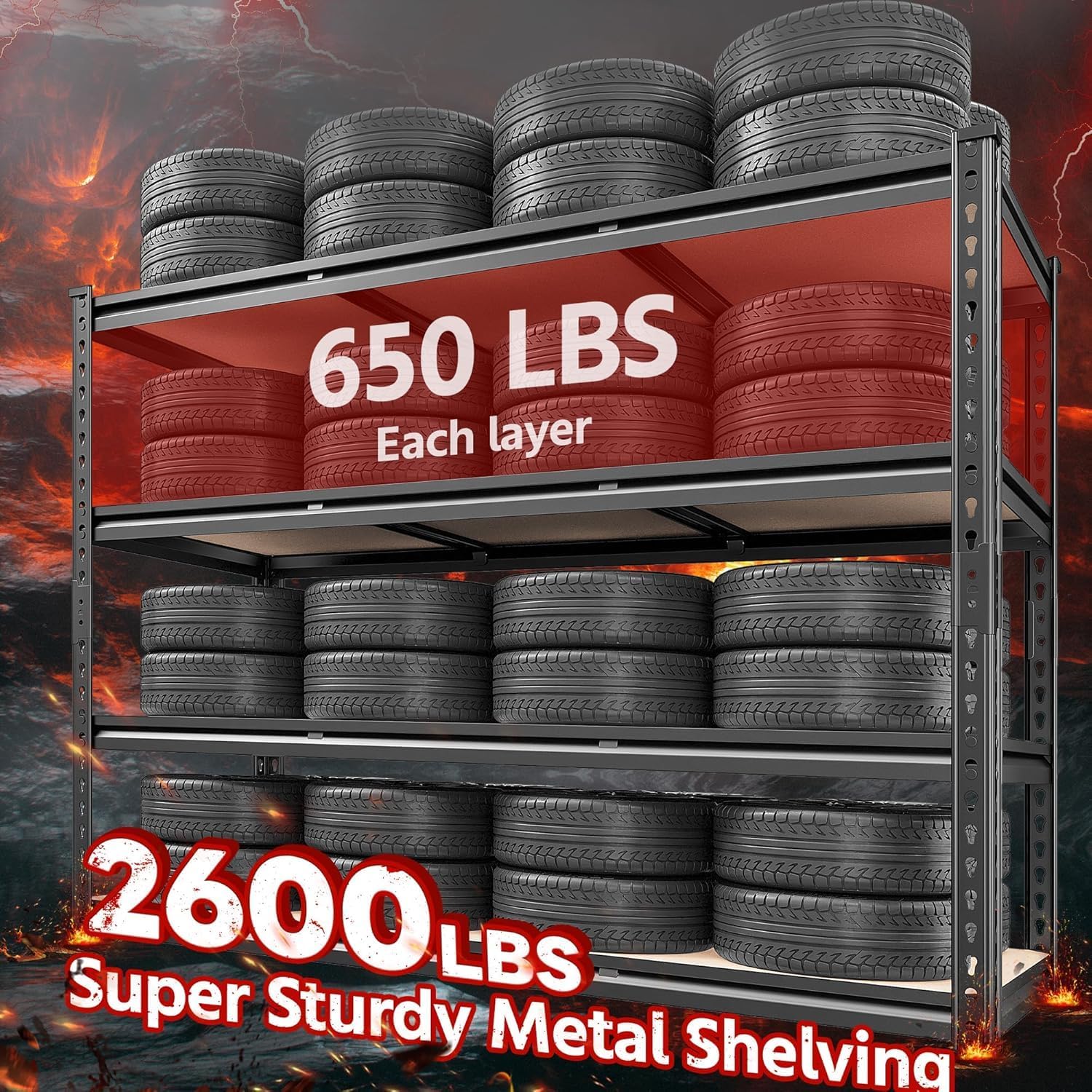 - 【2600LBS Capacity Garage Storage Shelves Heavy Duty】REIBII heavy duty garage shelving is constructed with reinforced steel legs and rolled-edge columns, featuring a high-quality metal frame combined with stable 7mm thickened MDF board. Each metal shelf, supported by beams underneath, has a weight capacity of up to 650 lbs, contributing to an overall bearing capacity of 2600 lbs. This design enhances the sturdiness of the garage shelves and enables efficient storage of numerous items.