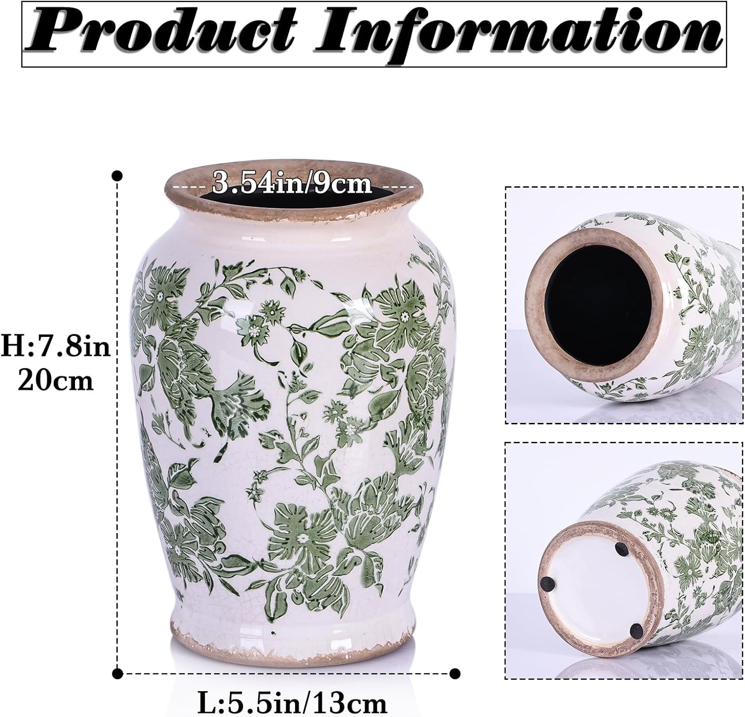 Vintage Vase for Flowers,Green Chinoiserie Ceramic Vase,Rustic Farmhouse Cracked Vases,for Flower Arrangement,Living Room, Office, Shelf, Fireplace Tables,Centerpieces,Chinoiserie Pottery Decor(B)