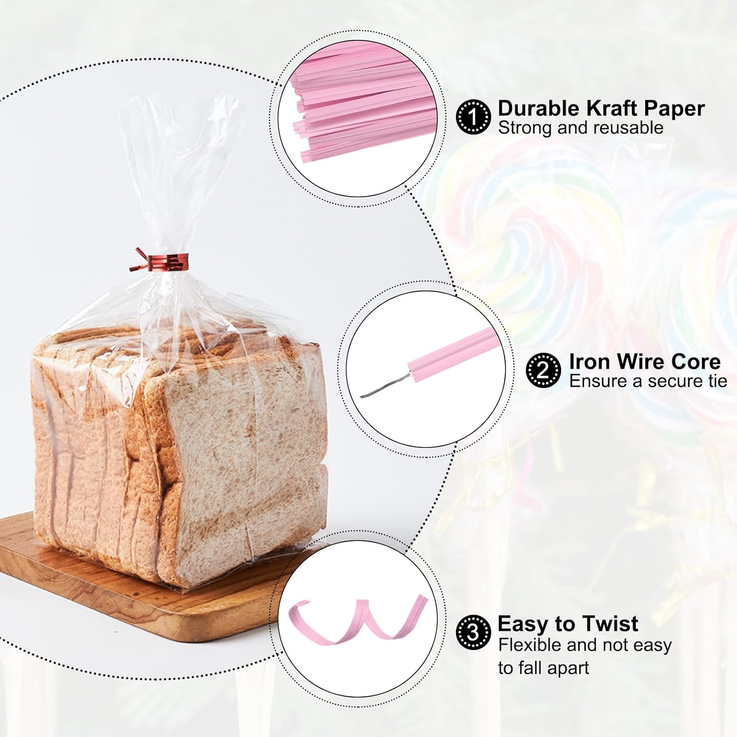 HARFINGTON 1000pcs Bag Twist Ties 3.5" Reusable Kraft Paper Twist Ties Wire Cable Ties for Party Bread Candy Cake, Light Pink