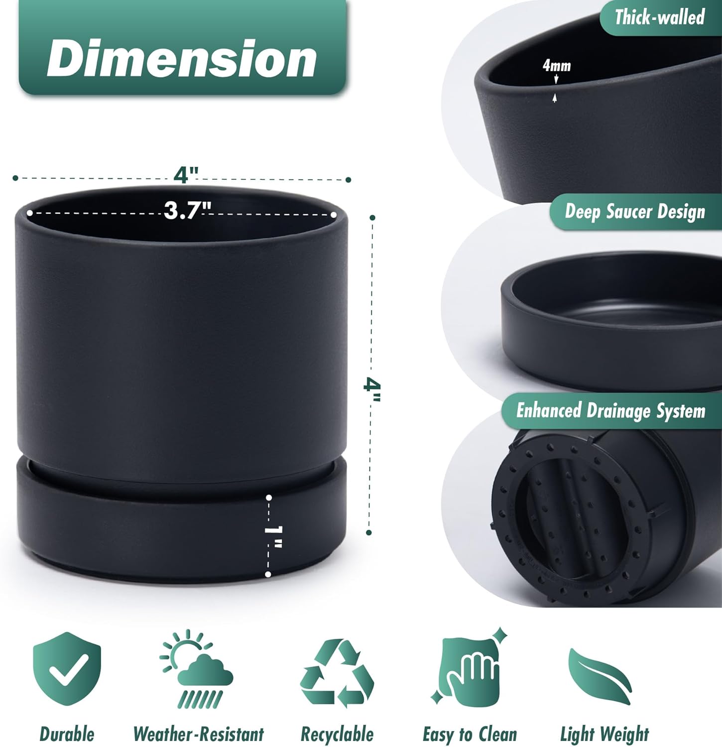 Phoenix Vine 4 Inch Planter Pot with Drainage Hole & Saucer, Deep Water Catch Tray, Straight Cylindrical Round Pot for Plants, Matte Black, Pack of 6, 23-C-R-6